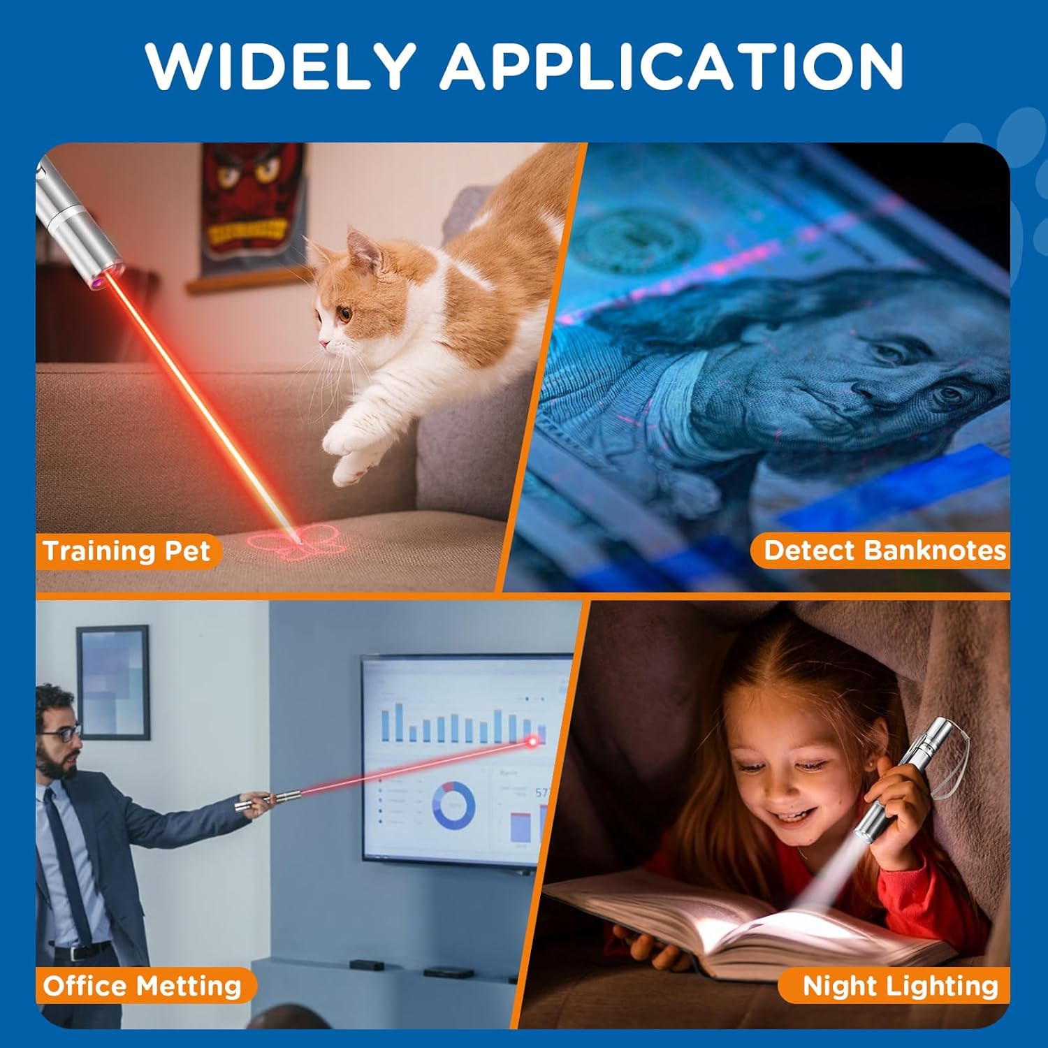 - Multiple Function: The cat light can also make you a presenter. It is bright that you can see clearly, making speeches or explanations easier and more convenient. What’s more, you can turn on the switch with a single press instead of holding down on the button to keep lighting like most other cat flashlight do. Lighting mode can glow in the dark. Purple mode can detect counterfeit money.