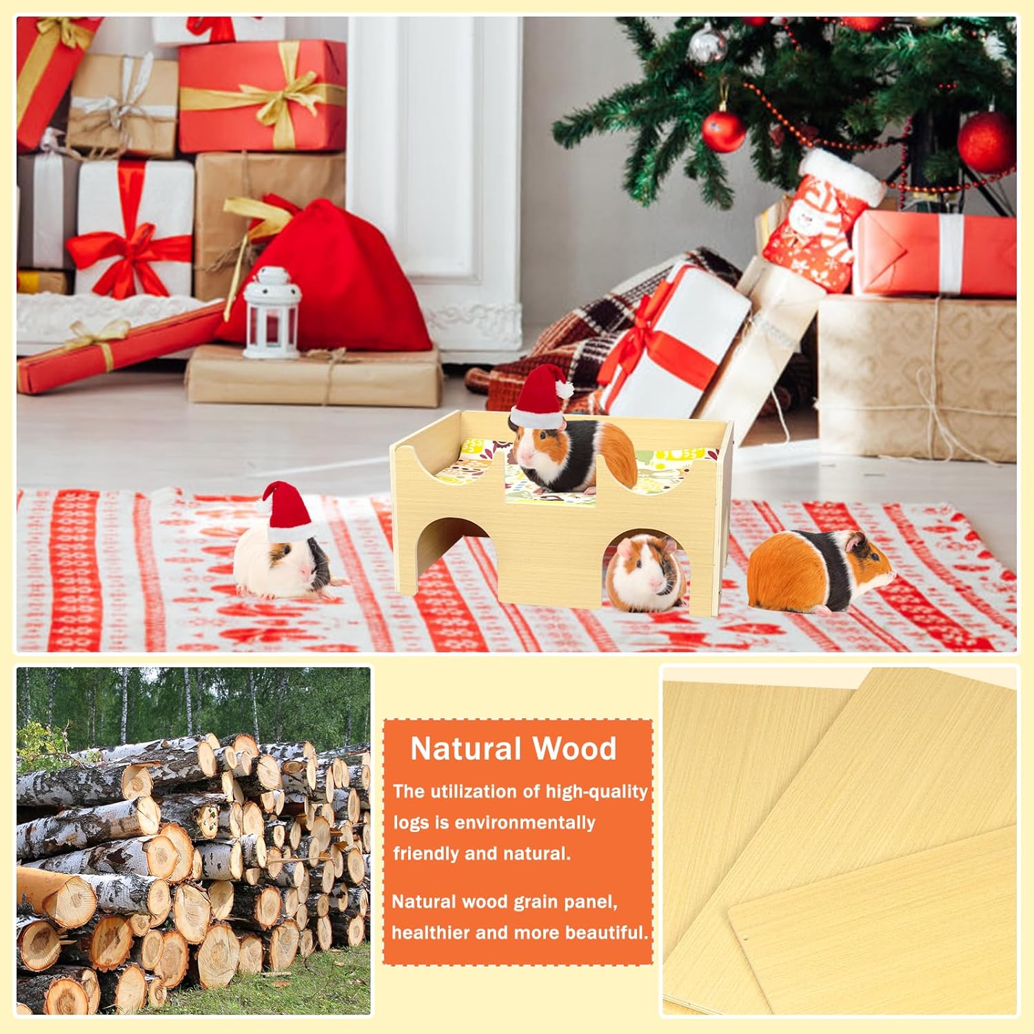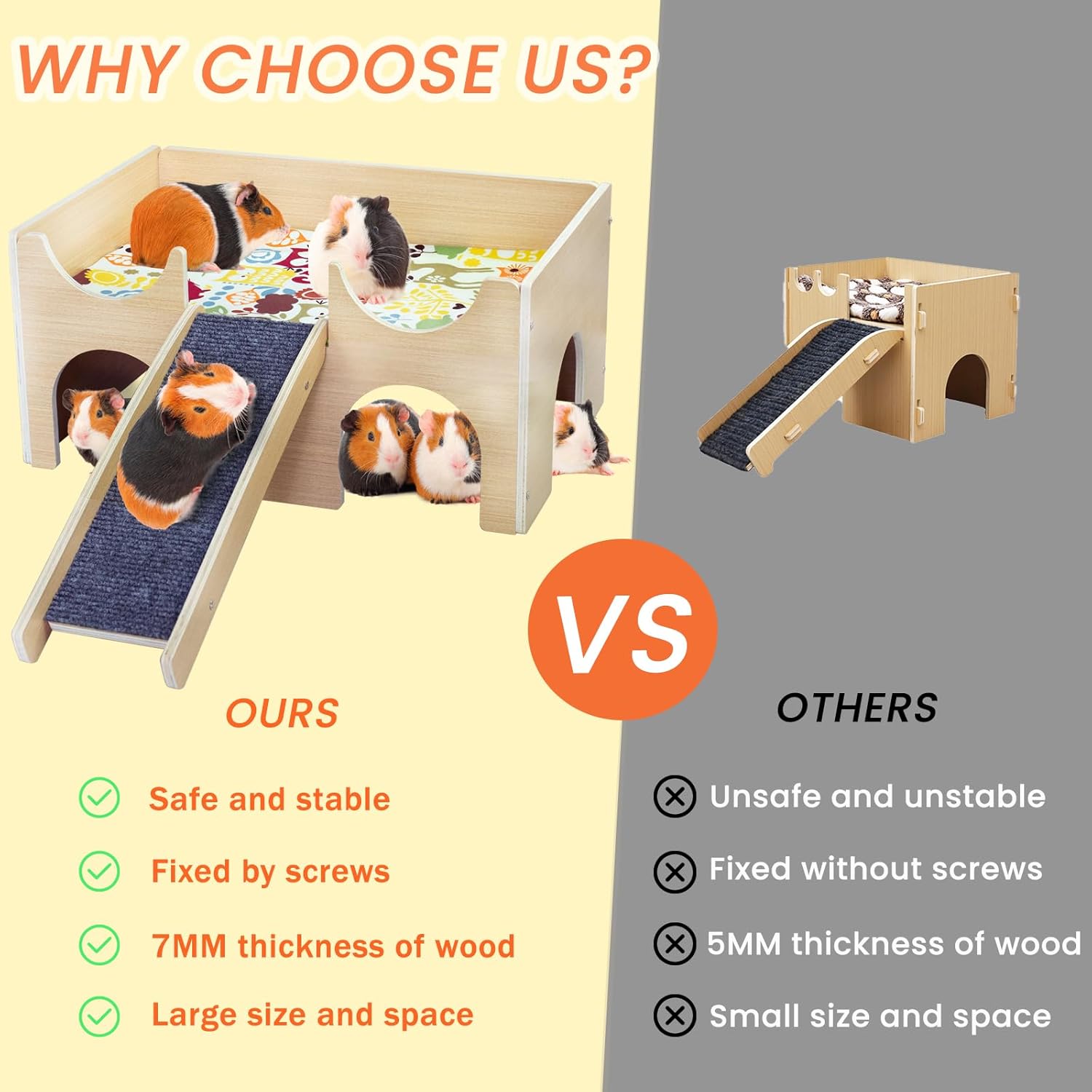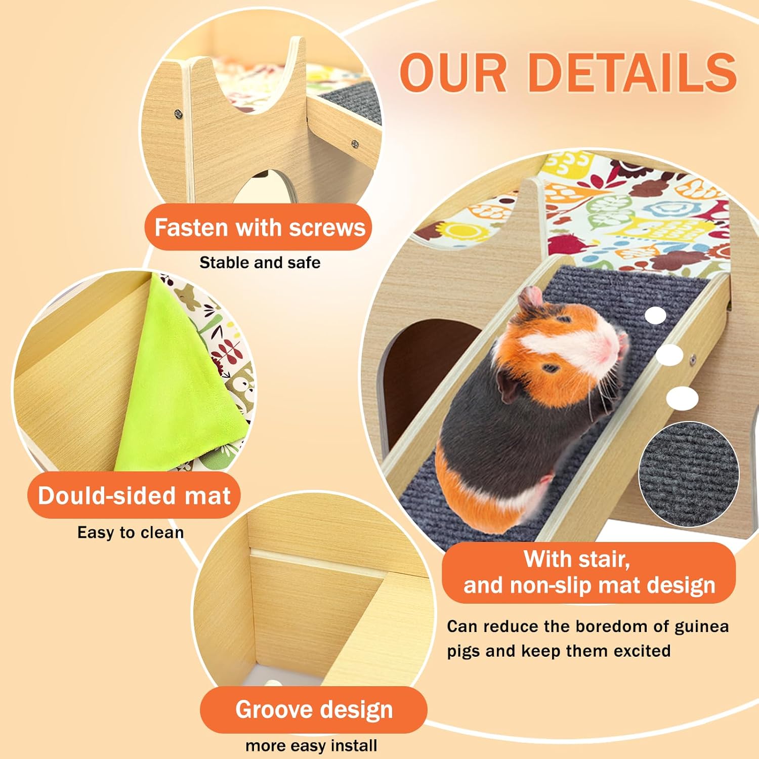 - 【 Safety-First Quality】Our guinea pig house is made with 100% natural wood. The guinea pig accessories mats and ramp are both odorless and animal-friendly. Let your guinea pig treat, run, and jump with confidence. We strive for excellence in every product we make