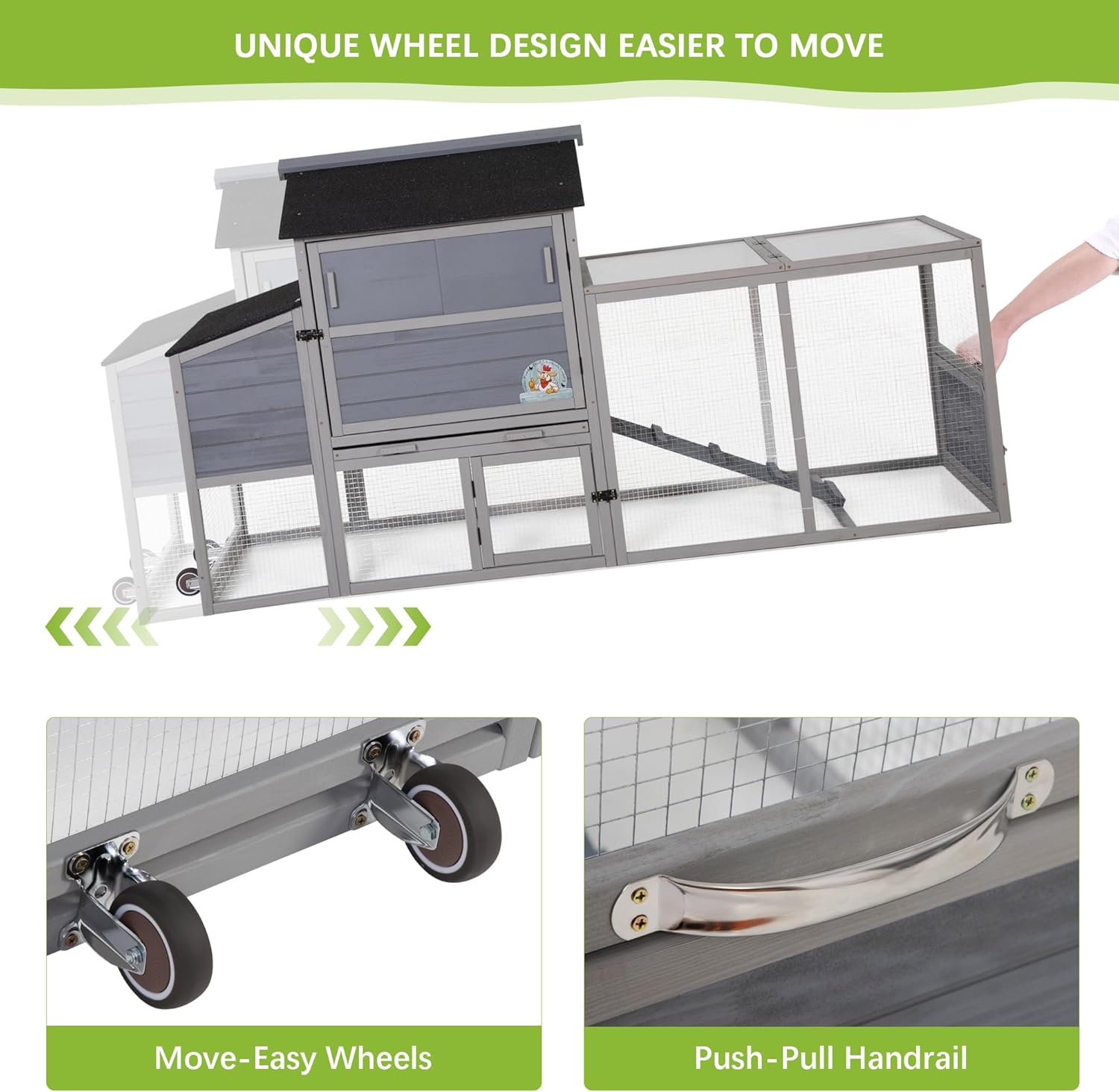 - 【Chicken Coop with Ample Space】: Measuring 82.29 inches in total length, this chicken coop provides chickens with a spacious living area and run area on the ride side for free roaming and exercise freely, suitable for 2 adult chickens or other similar sized pets.