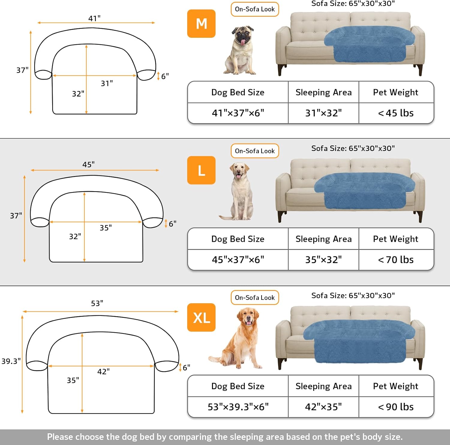 - 【Multiple Size Selection】The couch pet bed has 5 sizes for you to choose from. M: 41"x37" dog bed for medium dogs. L: 45"x37" dog bed for large dogs. XL: 53"x39.3" dog bed for large dogs. We have enlarged the sleeping area for pets to give dogs more space.