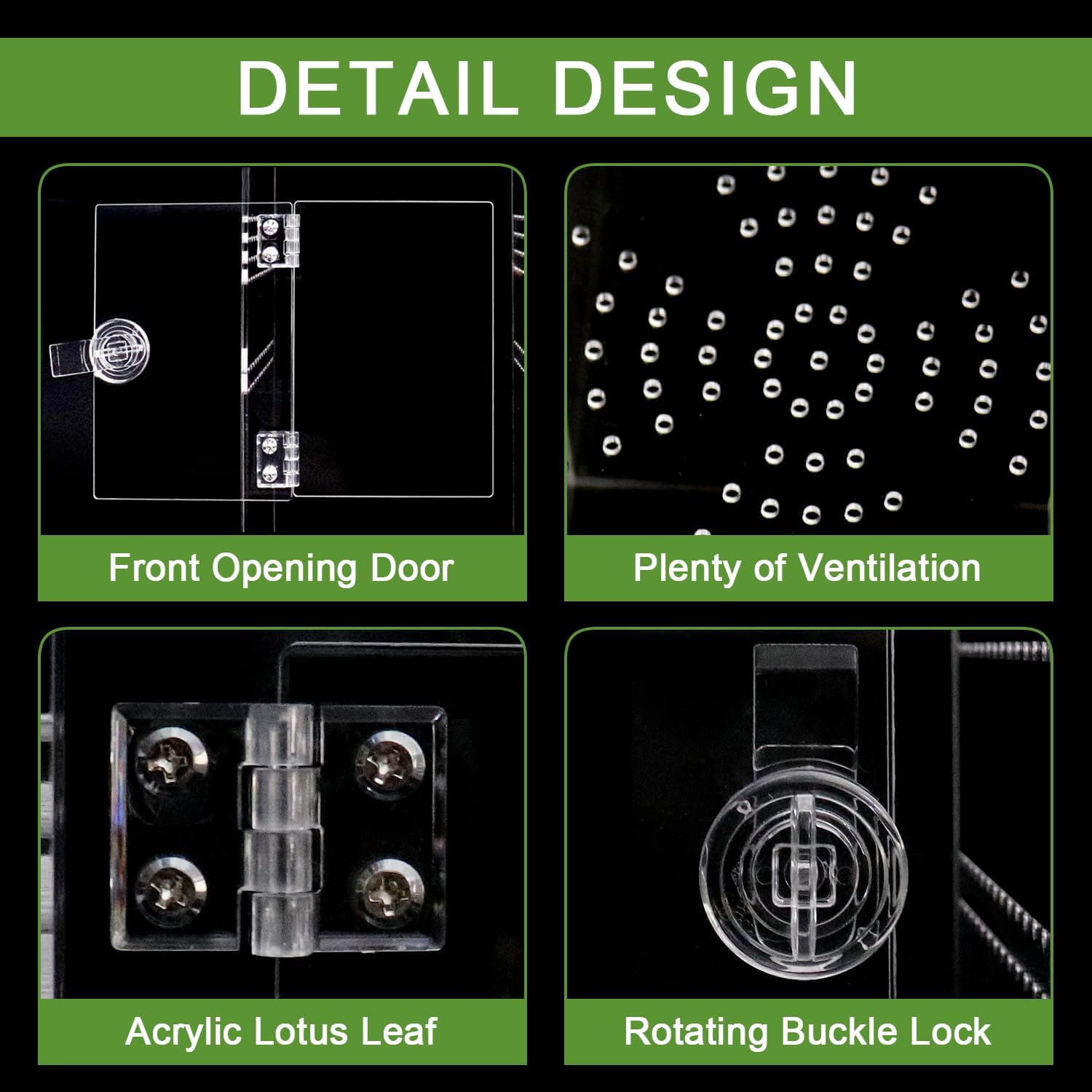 - 【Durable and Transparent Acrylic Enclosure】Our spider enclosure is crafted from high-quality thick acrylic, which is resistant to yellowing or clouding over time, ensuring clear 360-degree views, more convenient for you to clearly observe the the behavior of pets at any time and anywheres