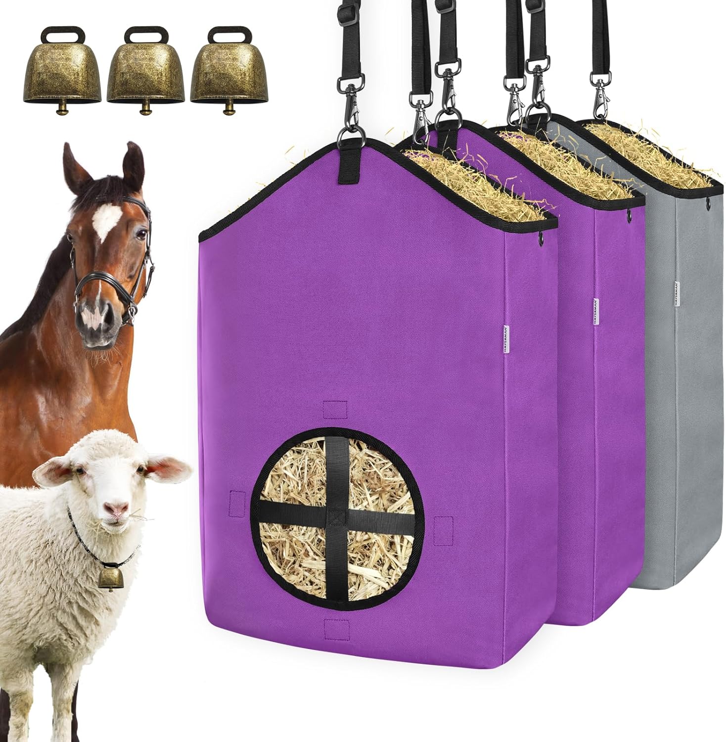 - Strong Metal Clasp:The clasp of the hay bags is made of thick zinc alloy metal, sturdy and long-lasting,no need to worry about breaking after a period of use.