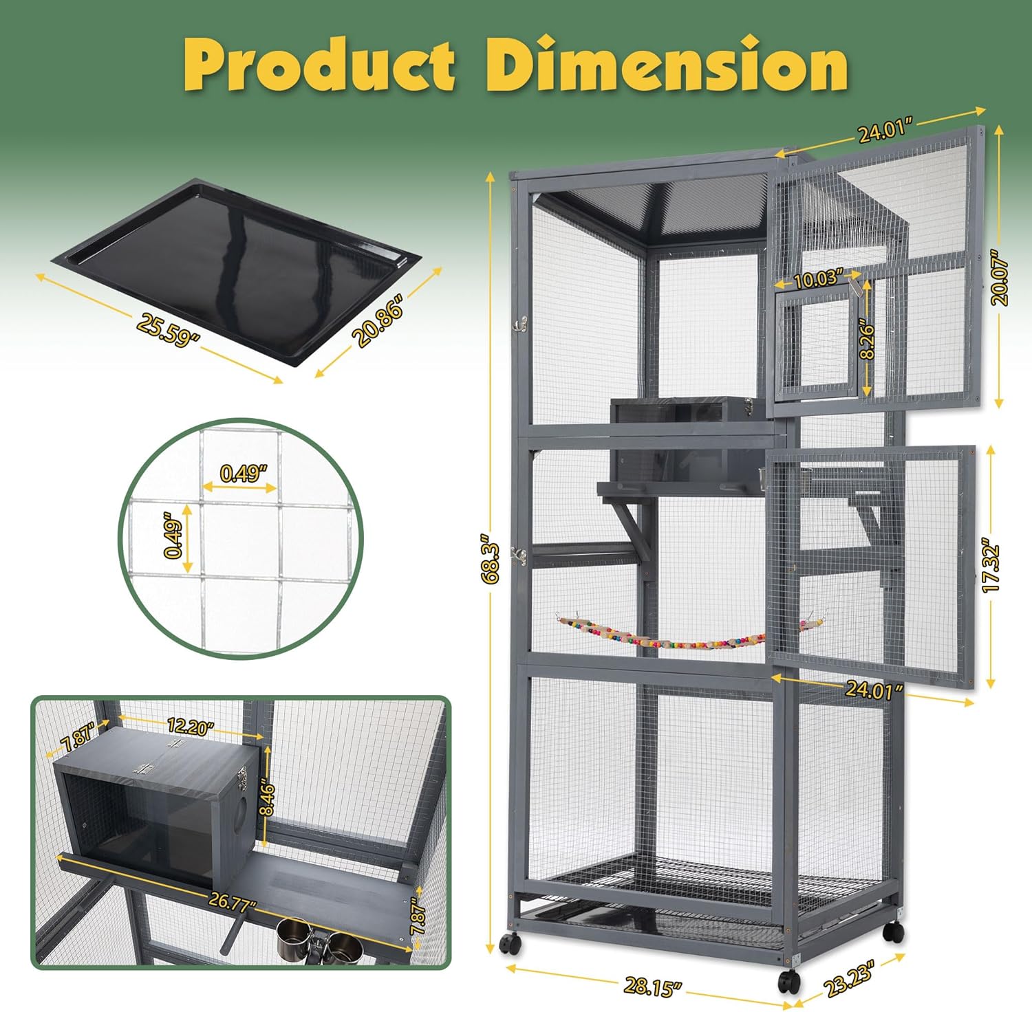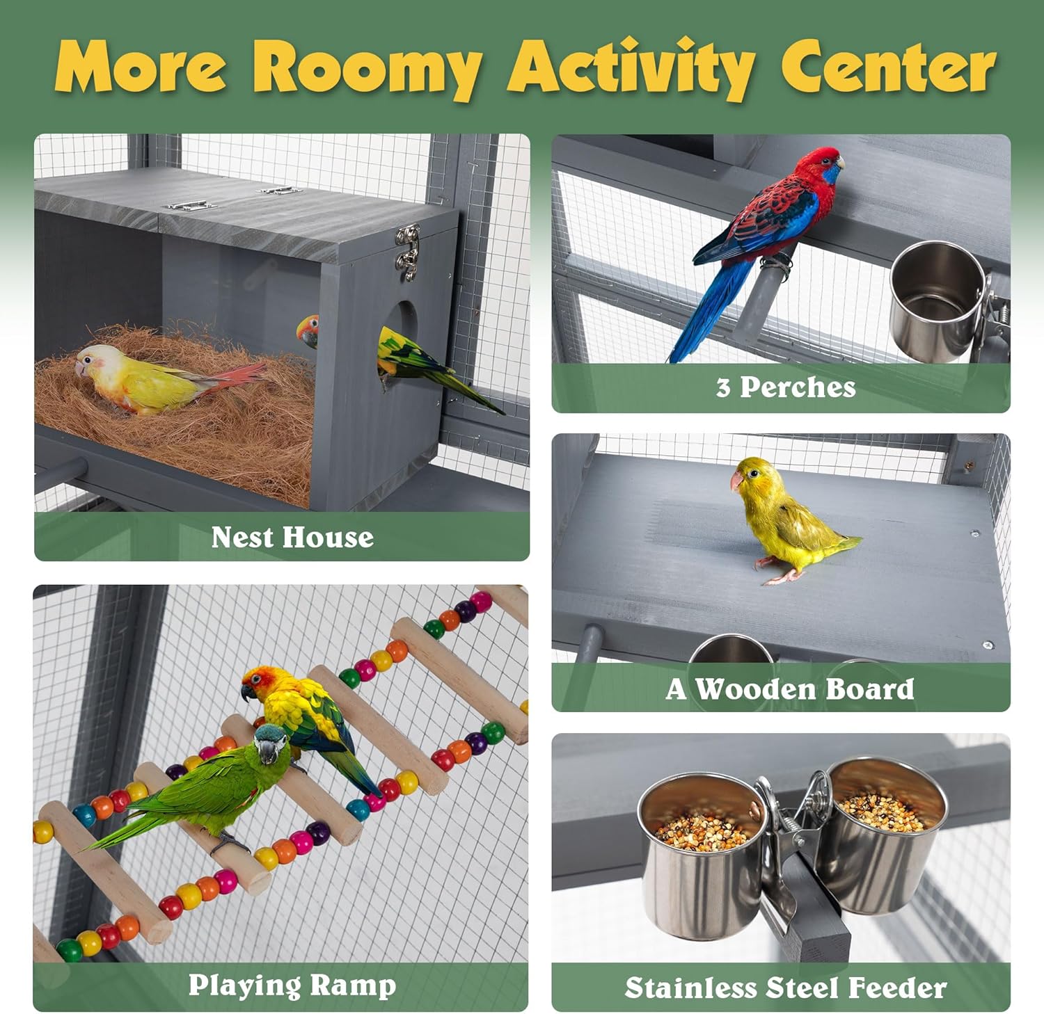 - 【Perfect Bird Playground】: This bird aviary is equipped with large nest house with 1 pull-out tray and 1 feeder. The spacious space not only accommodates their need for room to move but also allows them to spread their wings, take graceful flights, and enjoy a sense of freedom.