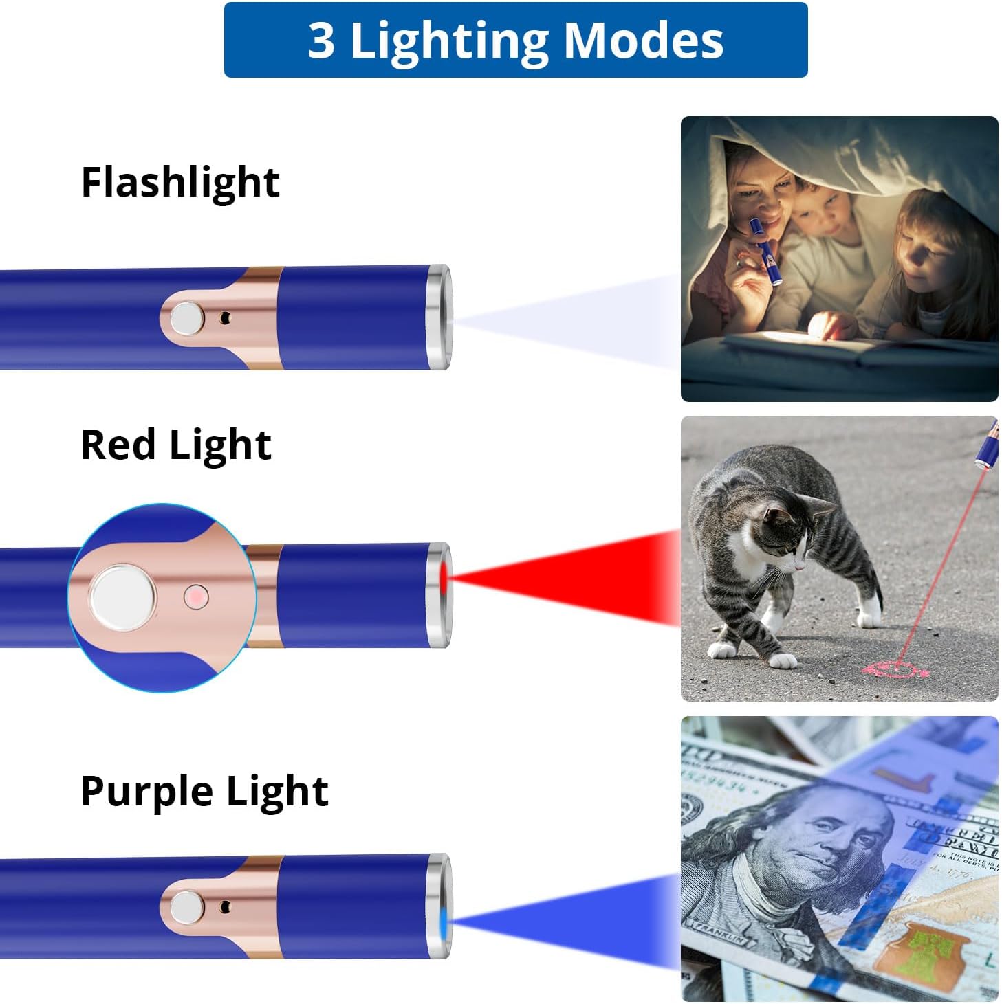 - Multiple Function: The cat toy can also make you a presenter. It is very bright. Plus, you can turn on the switch with a single press. White mode can glow in the dark; Purple mode can detect money.