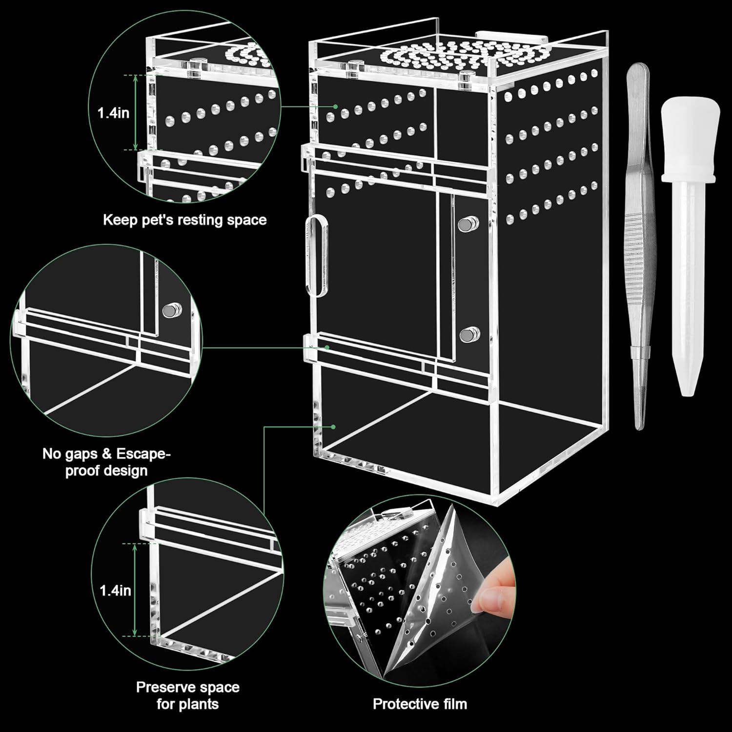 - 【Essential Jumping Spider Enclosure for Pet Owner】The product includes a small jumping spider enclosure, 1 pair of tweezers with 5.5 inches in length, and 1 water suction tube. The acrylic terrarium measures 3x3x6 inches, and its interior can be set up as a mini ecosystem, mimicking the natural habitat of jumping spiders, thus satisfying children's curiosity