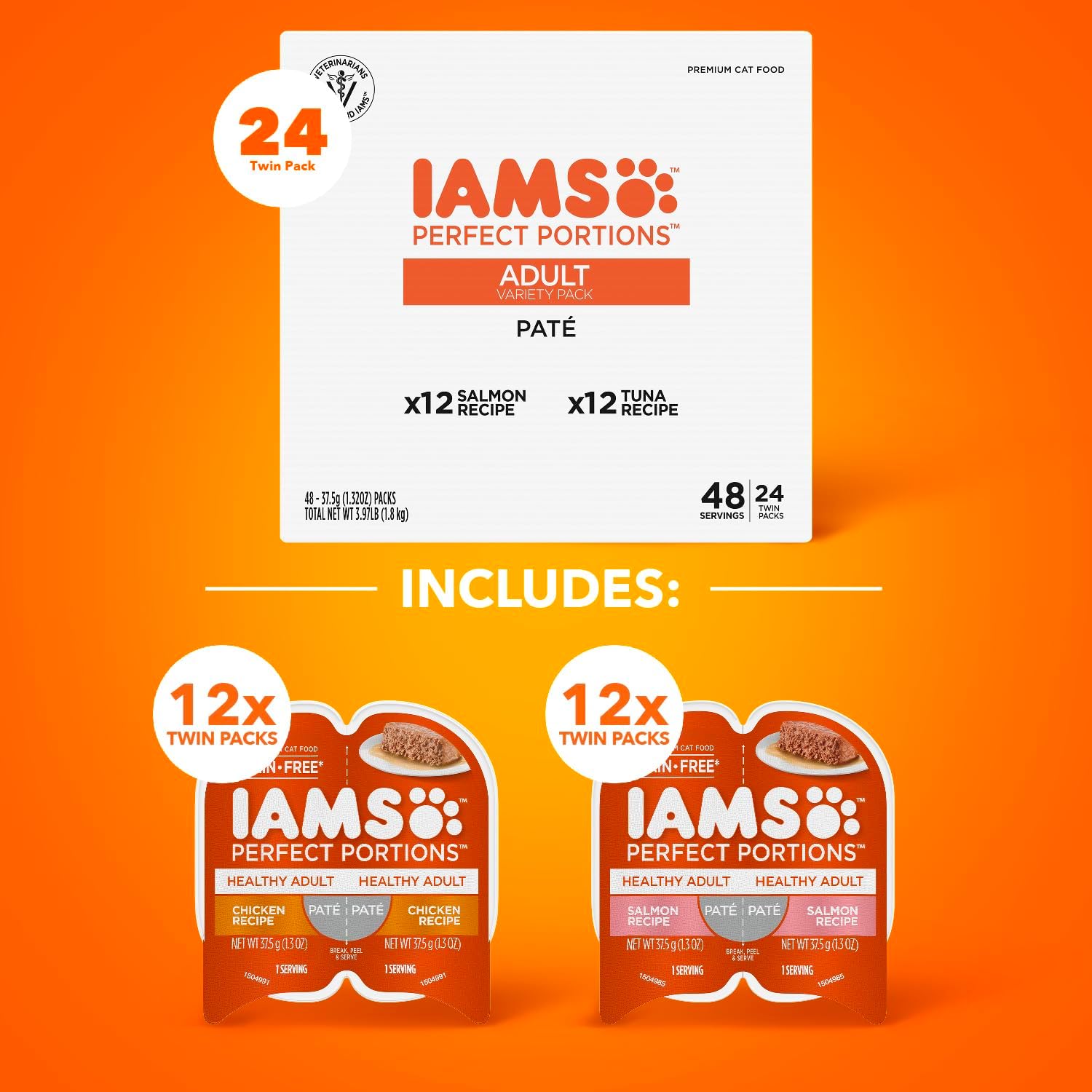 IAMS Perfect Portions Healthy Adult Wet Cat Food Pate, Chicken and Salmon Recipe Variety Pack, 2.6 oz. Twin-Pack Trays (24 Count, 48 Servings)