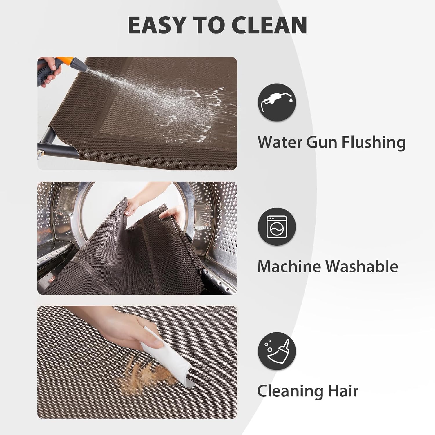 - 【DOG BED EASY CARE】: This cooling elevated dog bed is super easy to clean. Pet hair, vomit, and dust can be quickly wiped away, or you can wash the mesh with tap water, a hose, or a damp towel. For a deeper clean, use mild soap or natural cleaning agents. No more worries about pet odors, dirt, or excessive hair. (Note: Wash the U-shaped pillow separately with pet shampoo.)