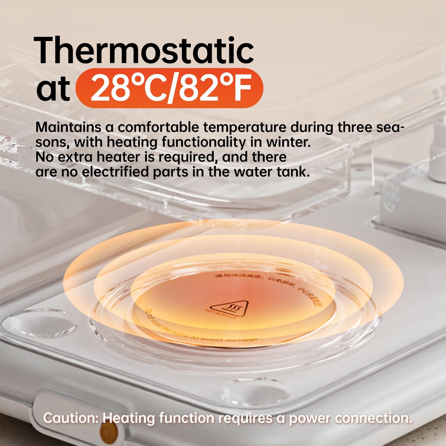 - Thermostatic Heating at 28°C/82℉ – Maintains water at a consistent 28°C/82℉ to keep pets hydrated in cooler weather. Heating function requires power connection. No electrified parts in the water tank for safety.
