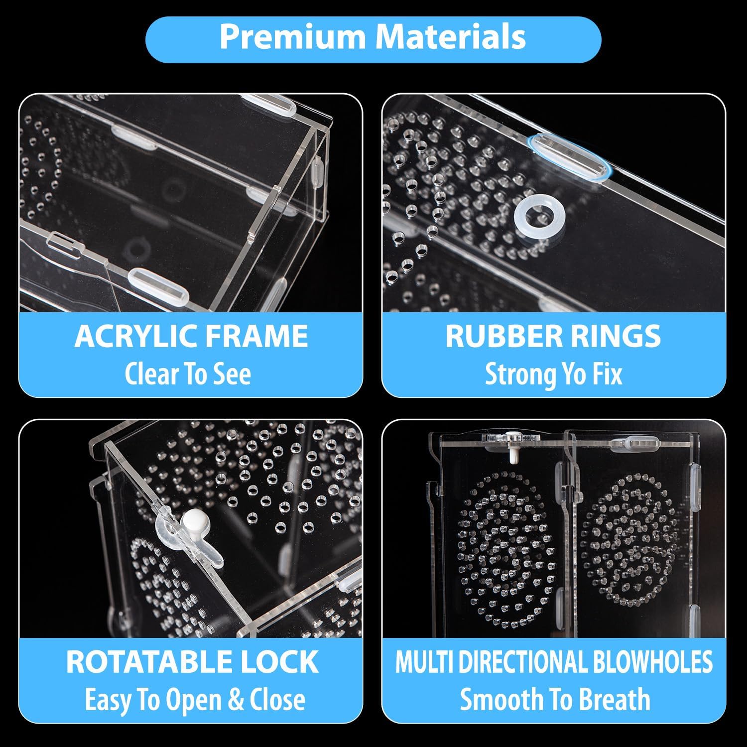 - ă Premium Material and SafeăThis reptile enclosure is crafted from high-quality acrylic plastic, reliable and sturdy to service for long time. High elasticity rubber rings can seal the whole cage well, and the double insurance of rotatable jailbreak lock on the top prevent pets from escaping