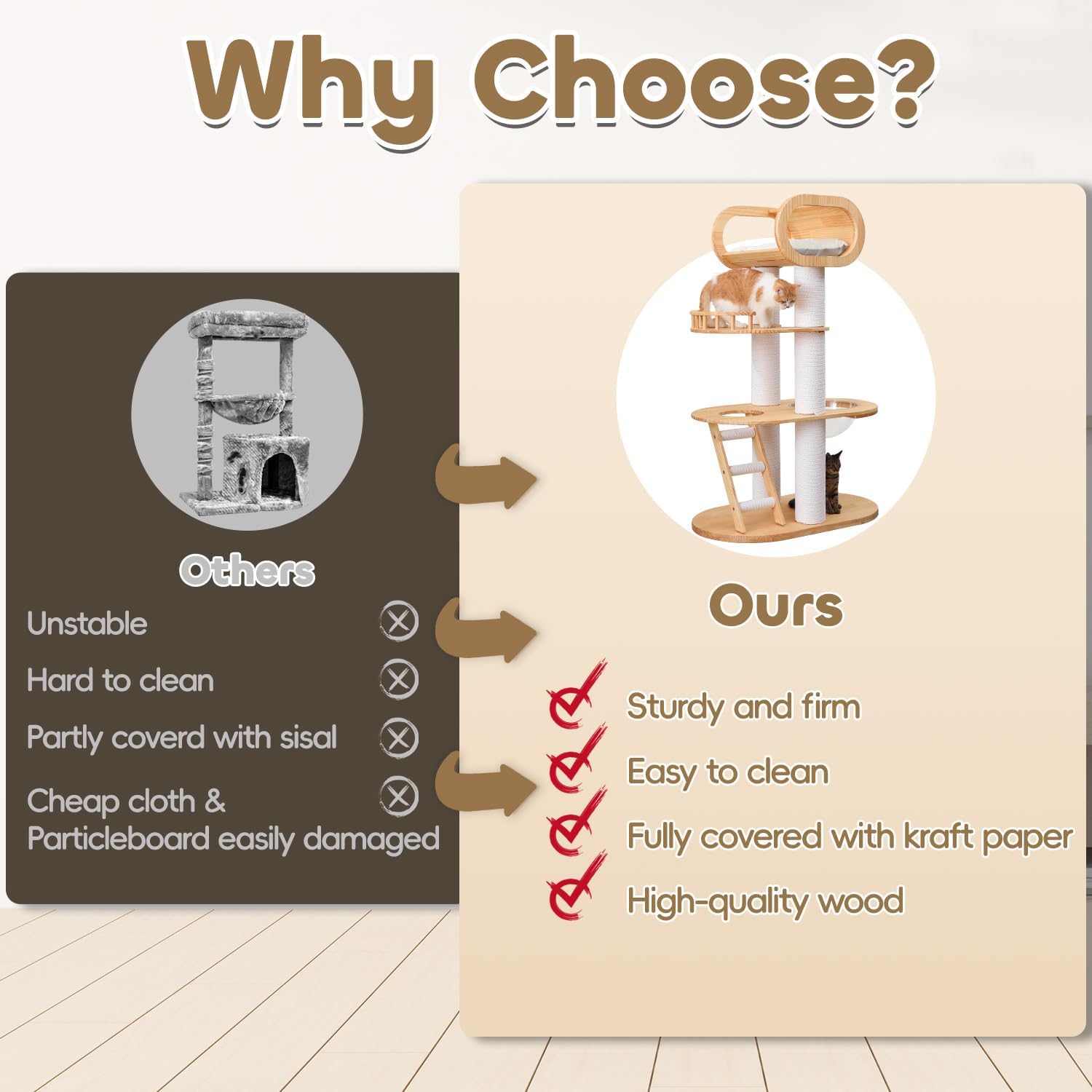 - 【Pet-friendly Material】Our cat tree crafted from superior 100% pine wood that combines luxury with stability. The scratching posts are fully wrapped in durable kraft paper rope, offering tactile pleasure and durability for your kitten. This cat furniture is designed to offer a safe, sturdy and entertaining home for your kittens.