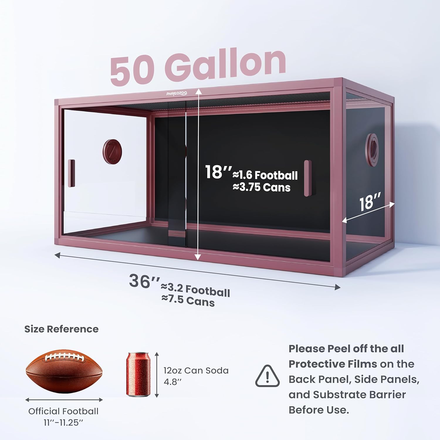 - ăSize MattersăPhailozoo 50 gallon reptile tank measures 36''Lx18''Wx18''H, perfect for desert and rainforest bioactive setup, such as bearded dragon tank, snake tank, and lizard tank. Spacious playground for your beloved reptiles to explore and thrive while being safe.