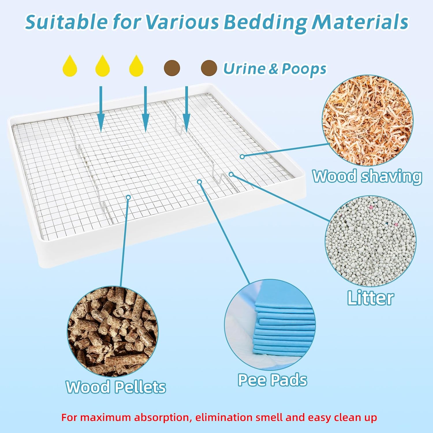 - Ultra Large Rabbit Tray: Our steel grids rabbit litter box is 22"/56cm x 18"/46cm x 3"/7.6cm (L*W*H), and the bottom depth 1.57 inches (Can be storaged 3 days shits of 2 adult rabbits); The extra large size and multi rabbits are able to fit at the same time with plenty of room to spare to set their feeding bowls on top of as well; Tthe rectangular shape fits nicely in the cage corner
