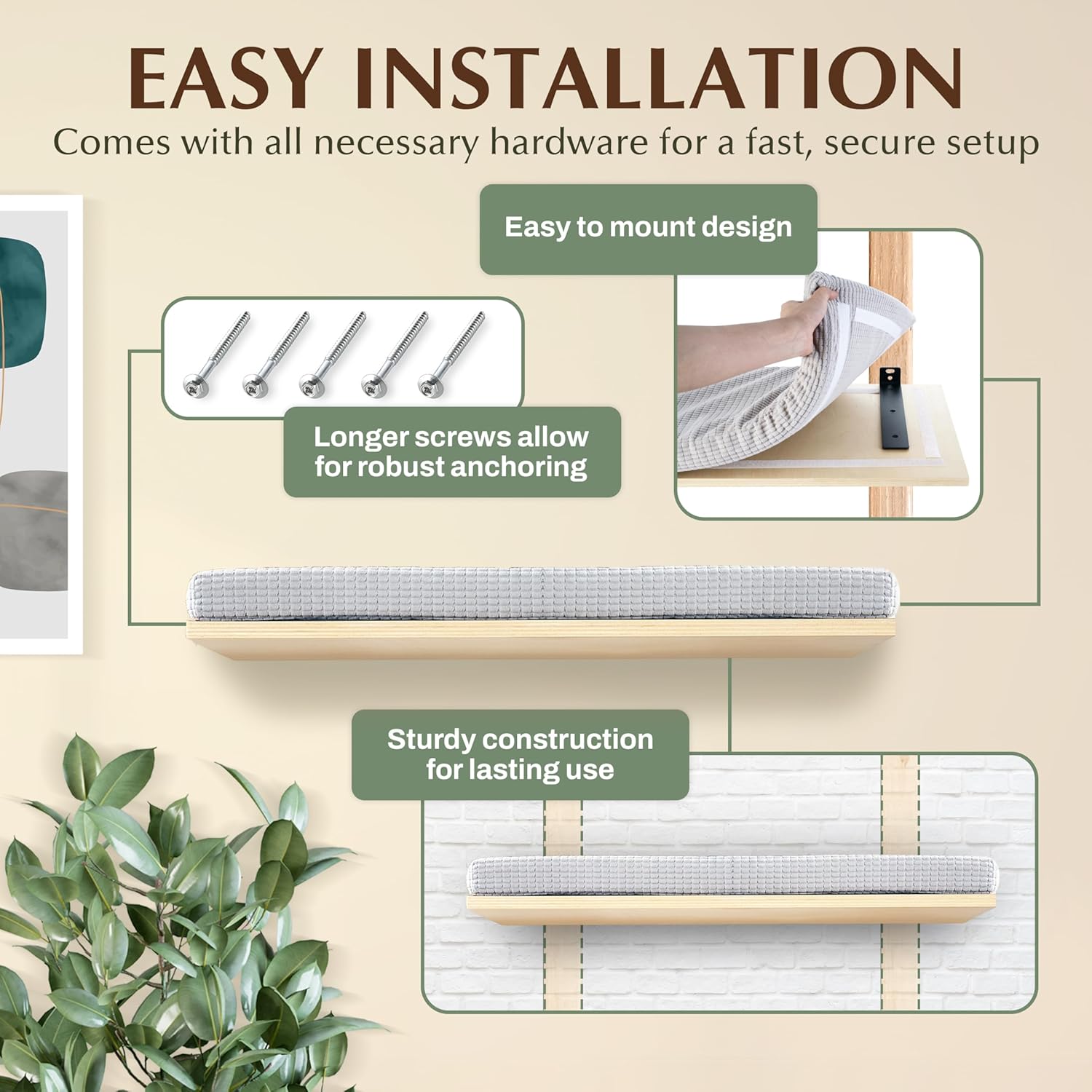 - EASY & SECURE INSTALLATION– The wall-mounted cat shelf mounts easily into 16" wall studs with included hardware, ensuring a sturdy cat wall perch. Perfect for creating a cat climbing wall or wall-mounted cat shelves set. Designed for hassle-free installation, this wall-mounted cat perch includes heavy-duty hardware and step-by-step instructions for mounting onto drywall, brick, or concrete. Hidden mounts maintain a sleek, modern look.