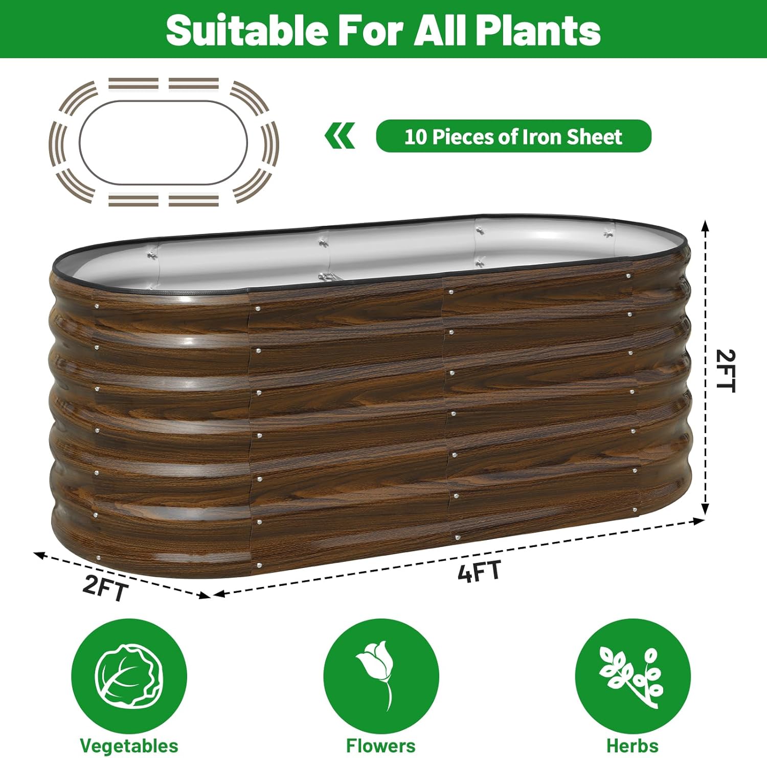 SnugNiture Galvanized Steel Raised Garden Bed, 4x2x2 ft, Outdoor Oval Deep Root Planter Box for Growing Vegetables, Flowers and Fruits