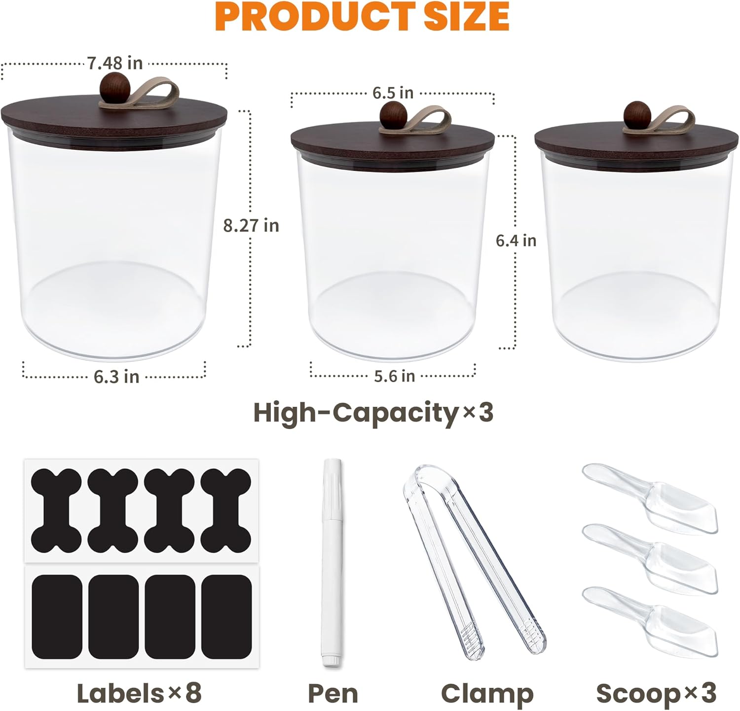 3 Pack Airtight Dog Food Storage Container, Dog Treat Container Dog Food Container with Wood Lids 8x7''&6x5'',Pet Food Storage Container,Cat Food Containers with Scoops,Clamp,Labels,Pens