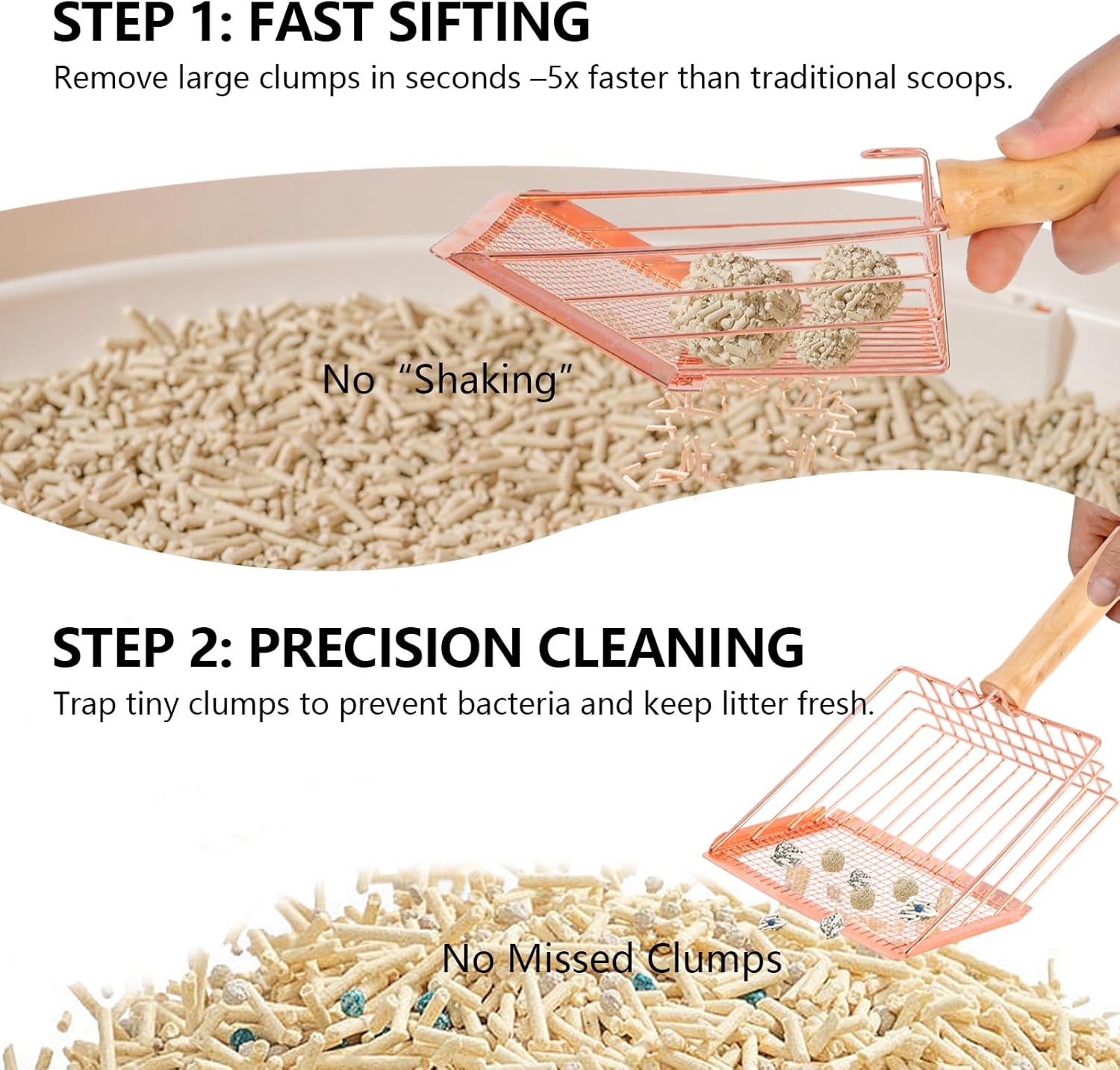 - ★ Comfortable & Ergonomic Design – The upgraded handle is now extra sturdy and won’t loosen over time. Made from solid wood and shaped for a natural grip, this stainless steel cat litter scoop follows ergonomic principles to reduce hand strain, making scooping easier and more comfortable.