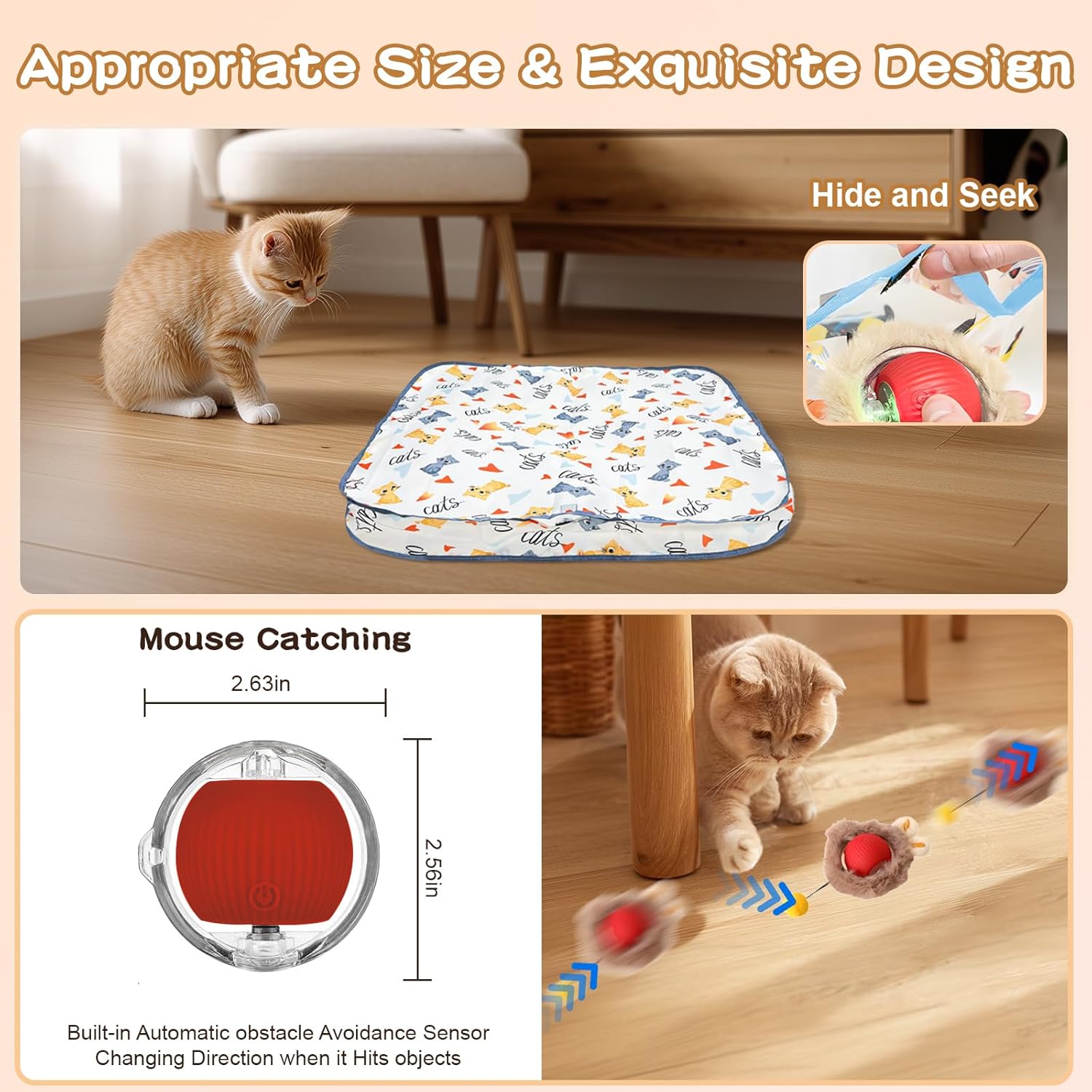 - 2 Ways to Play : Hide & Seek (ball in bag vibrates/moves erratically, entertaining cats alone); Solo Mode (works on carpets/hard floors with random movement, obstacle avoidance—grabs attention, sparks hunting instincts)