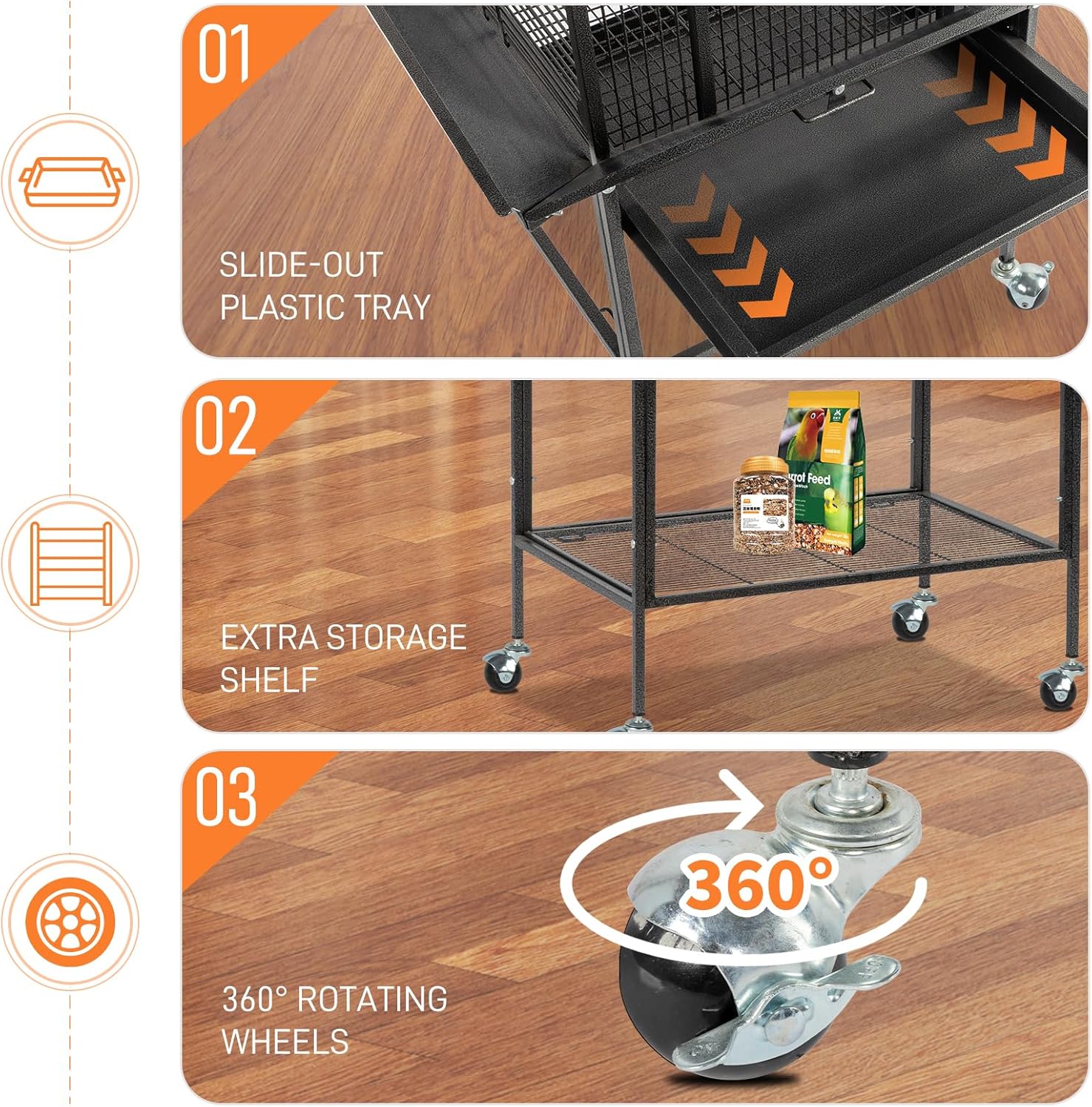 - Convenient Mobility: Equipped with rotating wheels for easy mobility, this cage can be effortlessly moved around. The detachable stand allows for flexibility in placement, whether indoors or outdoors.