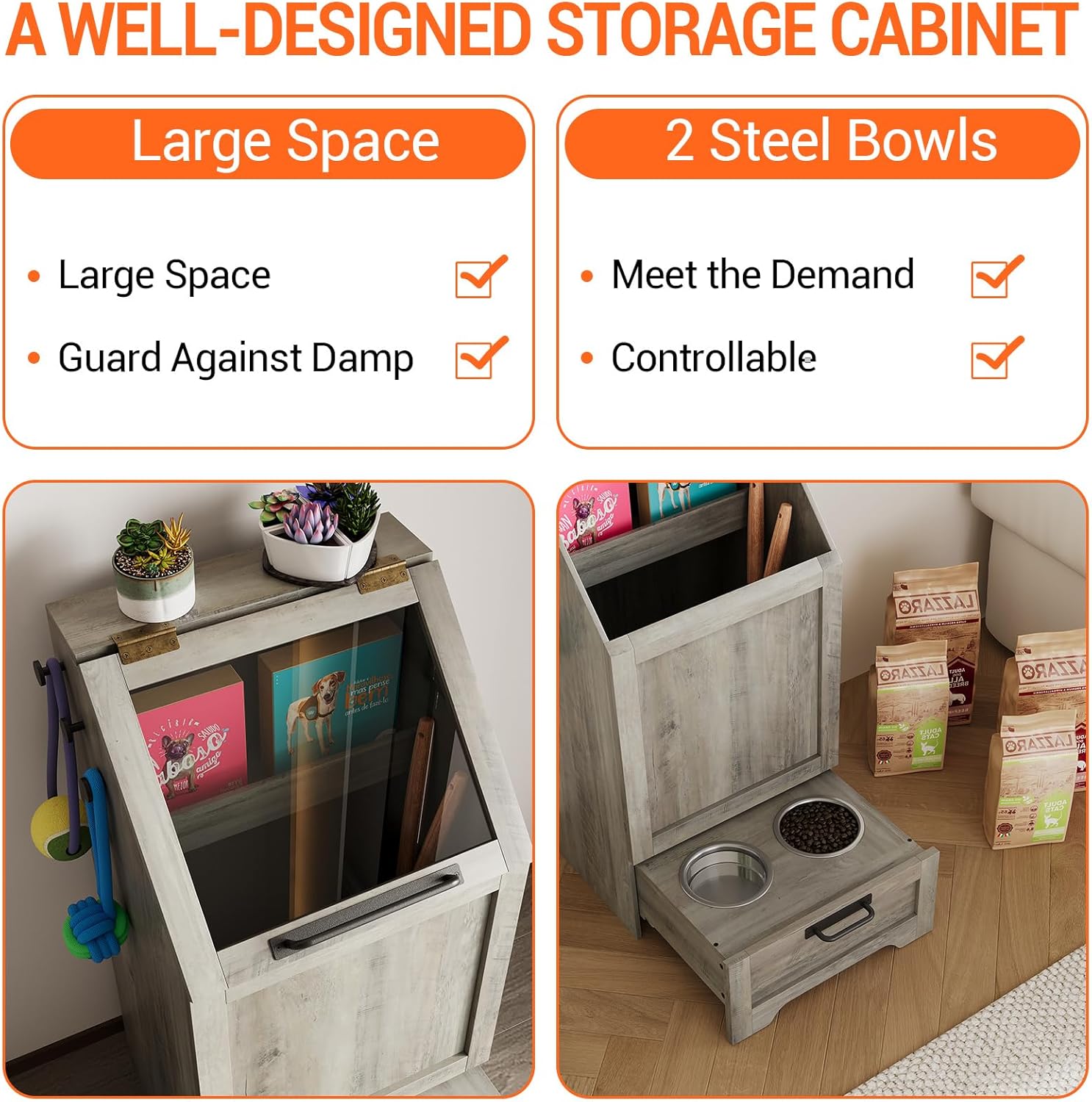 Dog Feeding Station with Storage Cabinet, 2 Elevated Bowls, FILP Top Food Storage Cabinet Container, Pet Feeding with 3 Hooks, Farmhouse Dog Feeder Station, Grey
