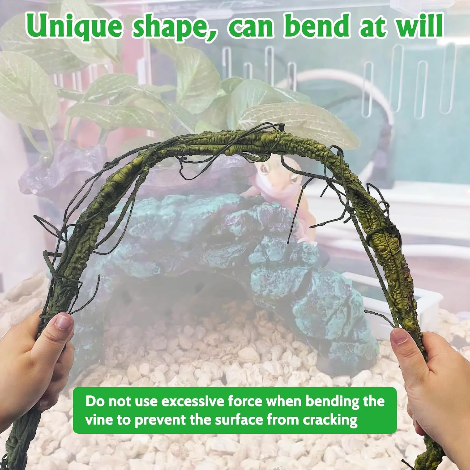 - Assembly & Use: Please use it in a large tank, at least 40 gallon, put in a tall terrarium better. Don't push too hard when bending the vine. The green leaves need to be washed before use