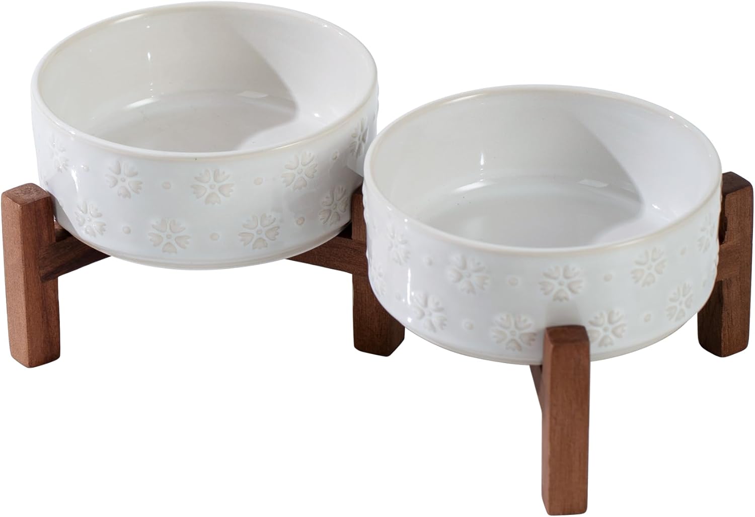 Ceramic 5.1inch Raised Double Bowls Set with Acacia Wood Stand, 2 Heights Elevated, Food & Water Bowls for Puppy, Kitty, Cats(13.5oz, Arctic White)