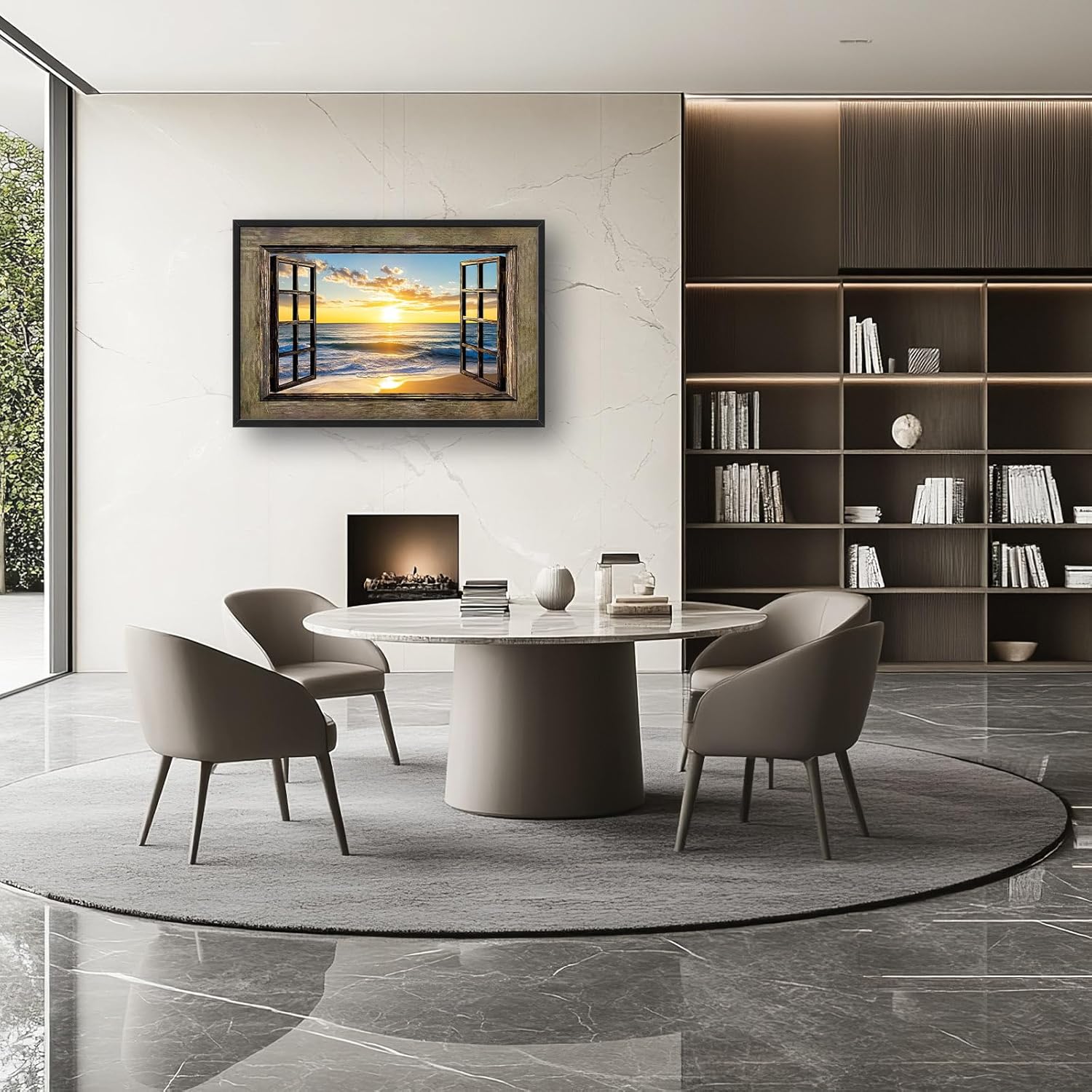 - 【Unique Design】A window frame with an ocean and sunset view, a beach scene with wooden frames, wall art for home decor, a beach landscape with open windows, photo-realistic, hyperrealism, high resolution.