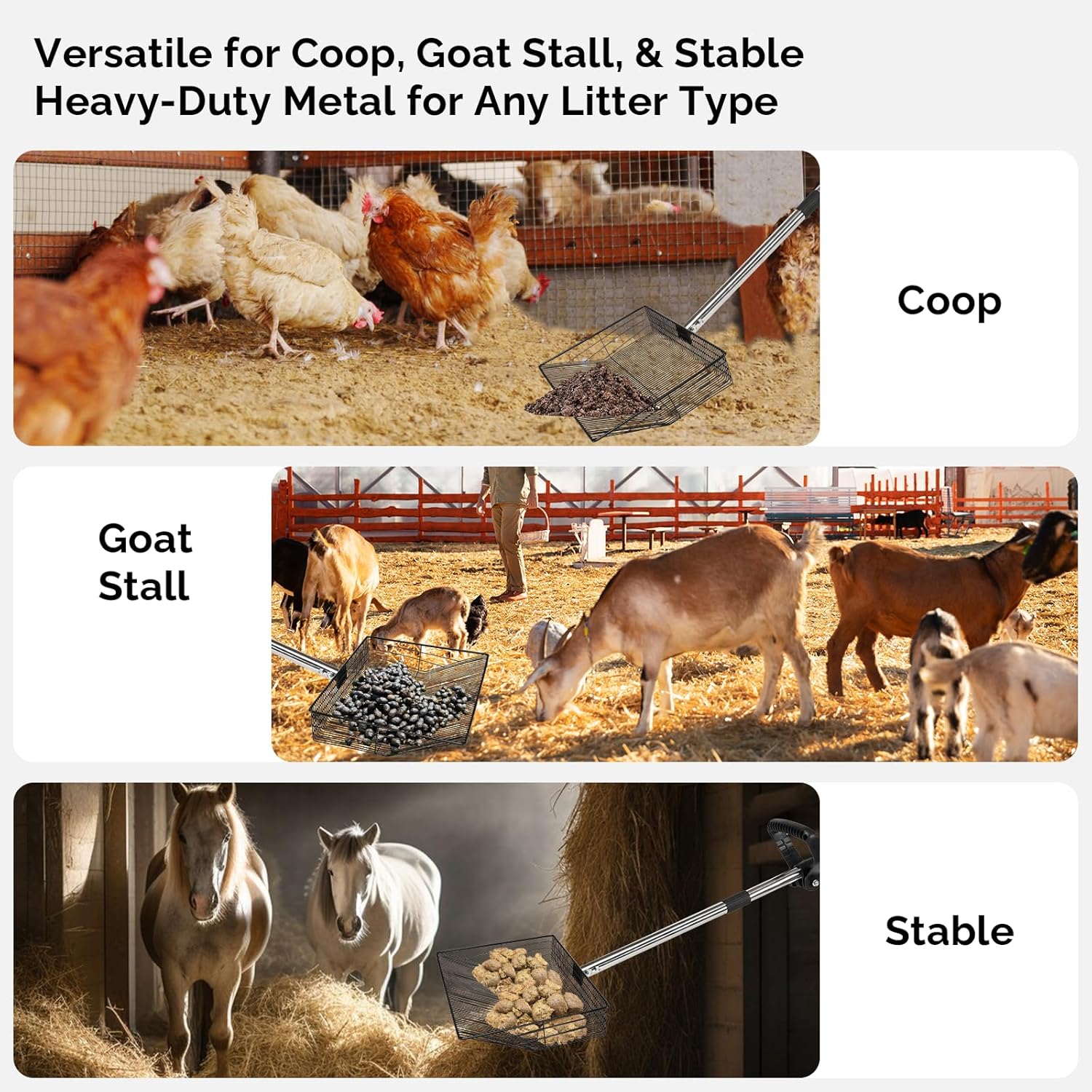 - ๐๐จ๐ซ๐ ๐ญ๐ก๐๐ง ๐ฃ๐ฎ๐ฌ๐ญ ๐ ๐๐ก๐ข๐๐ค๐๐ง ๐ฌ๐๐จ๐จ๐ฉ๐๐ซ: This multifunctional chicken pooper scooper works in chicken coops, goat stalls, horse stables, and more. The sturdy stainless steel construction handles all types of litter and waste. Perfect for cleaning sand, hay, or bedding, and also great for sifting cat litter, raking pine shavings in rabbit hutches, or cleaning dog kennels. The angled edges glide easily through packed bedding, grass, and gravel.