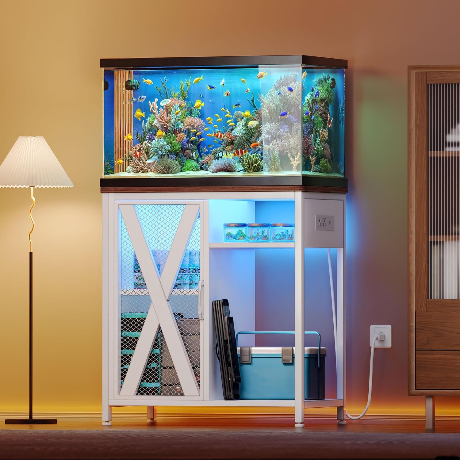YITAHOME Fish Tank Stand with Power Outlets & LED Light, 20-29 Gallon Metal Aquarium Stand with Cabinet for Fish Tank Accessories Storage for Turtle, Reptile Terrarium, 350LBS Capacity, White