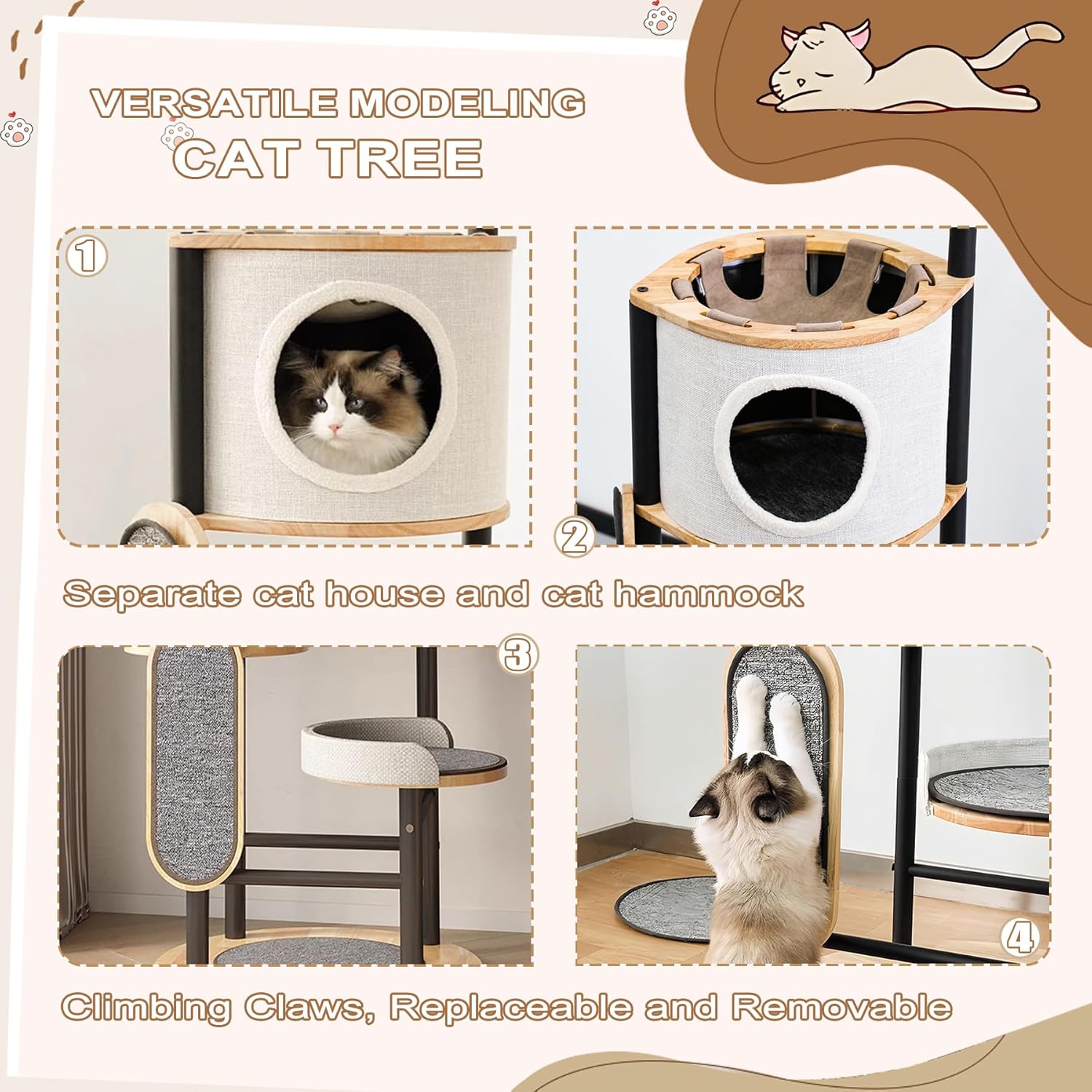 - 【ALL-IN-ONE CAT PLAYGROUND】Featuring a multi-level design for scampering up and down, the cat tower is equipped with perches, cat house, hammock, and scratching post, which increases the activity space for cats, promotes their exercise and vitality, and satisfies their climbing instinct and curiosity.