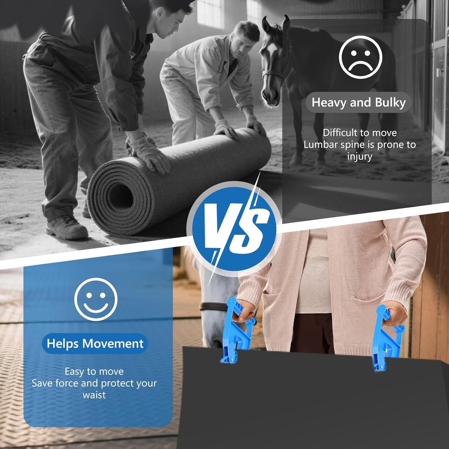 - Ergonomic Handle Design: Heavy duty stall mat handlers designed with ergonomics in mind, the handle allows anyone to easily grasp and operate the tool, making it simple to lift and move heavy mats with minimal effort.