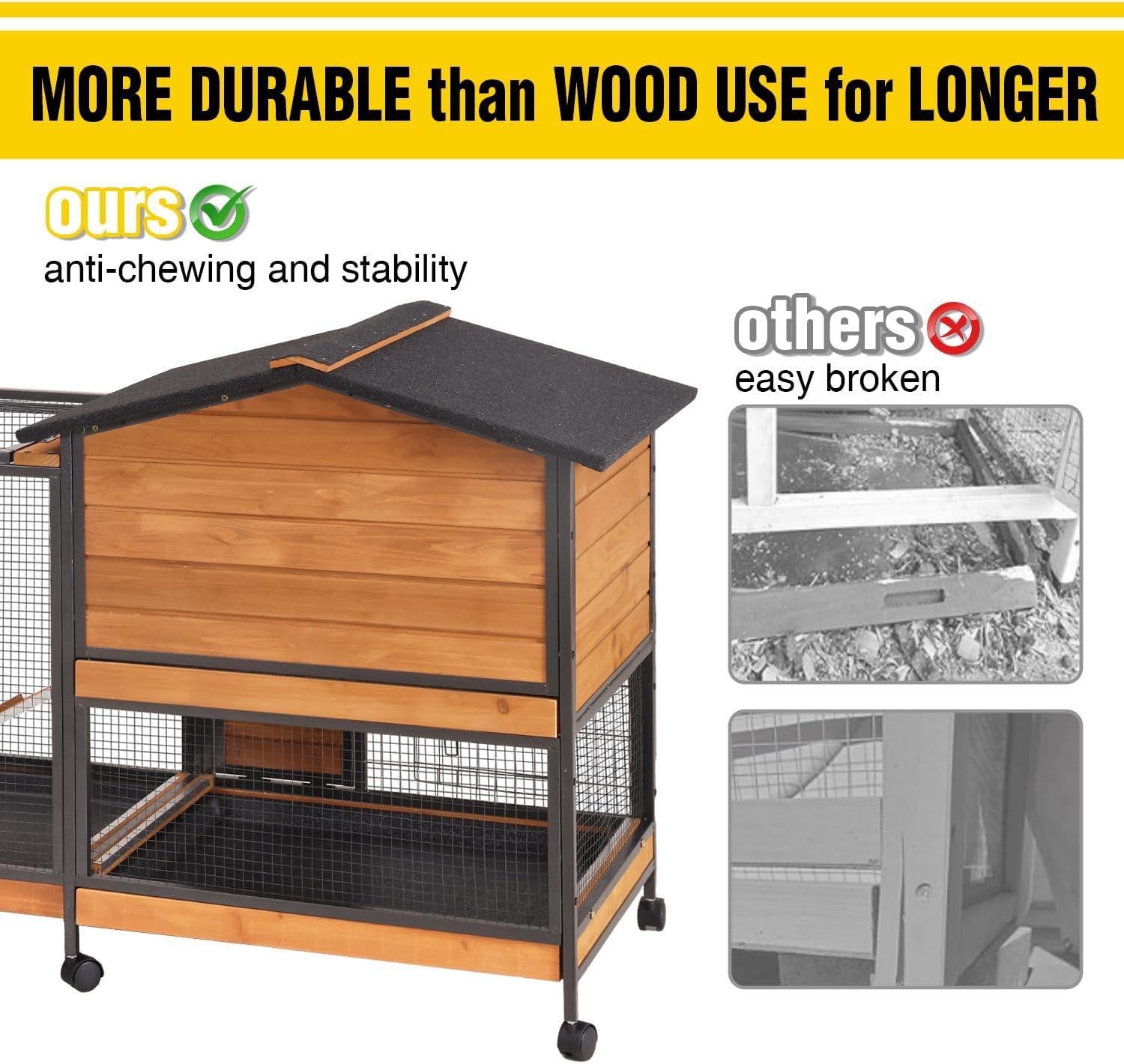 - Sturdy Metal-Frame Construction:This rabbit cage features a durable metal frame wrapped around high-quality wood, providing superior strength and stability while ensuring long-lasting use for your pets
