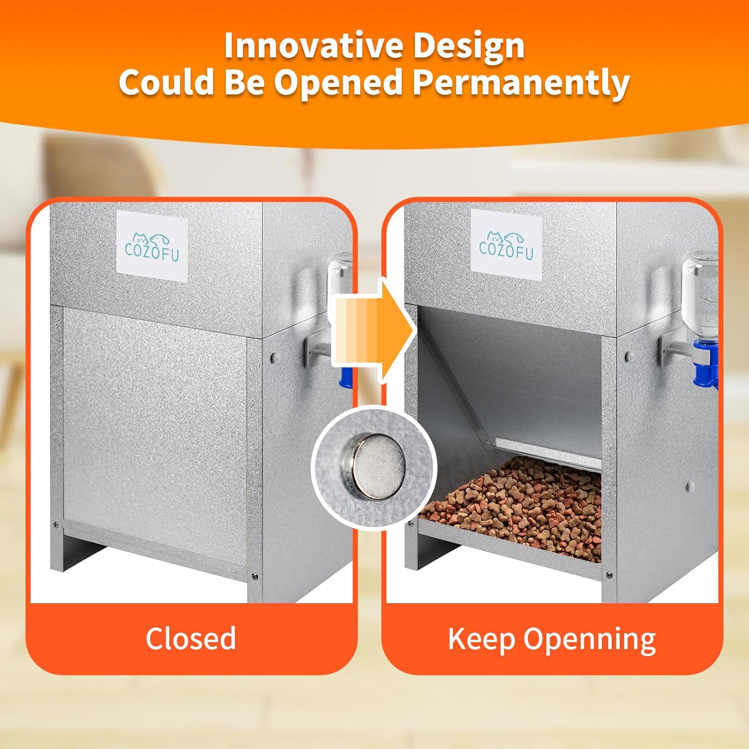 - WEATHER-RESISTANT DESIGN FOR DOGS: Crafted from heavy-duty, rust-resistant G90 galvanized steel, our automatic gravity dog food dispensers are perfect for indoor or outdoor use. For outdoor placement, we recommend positioning it under a large overhang, on a covered deck, porch, or carport to keep it safe from the elements