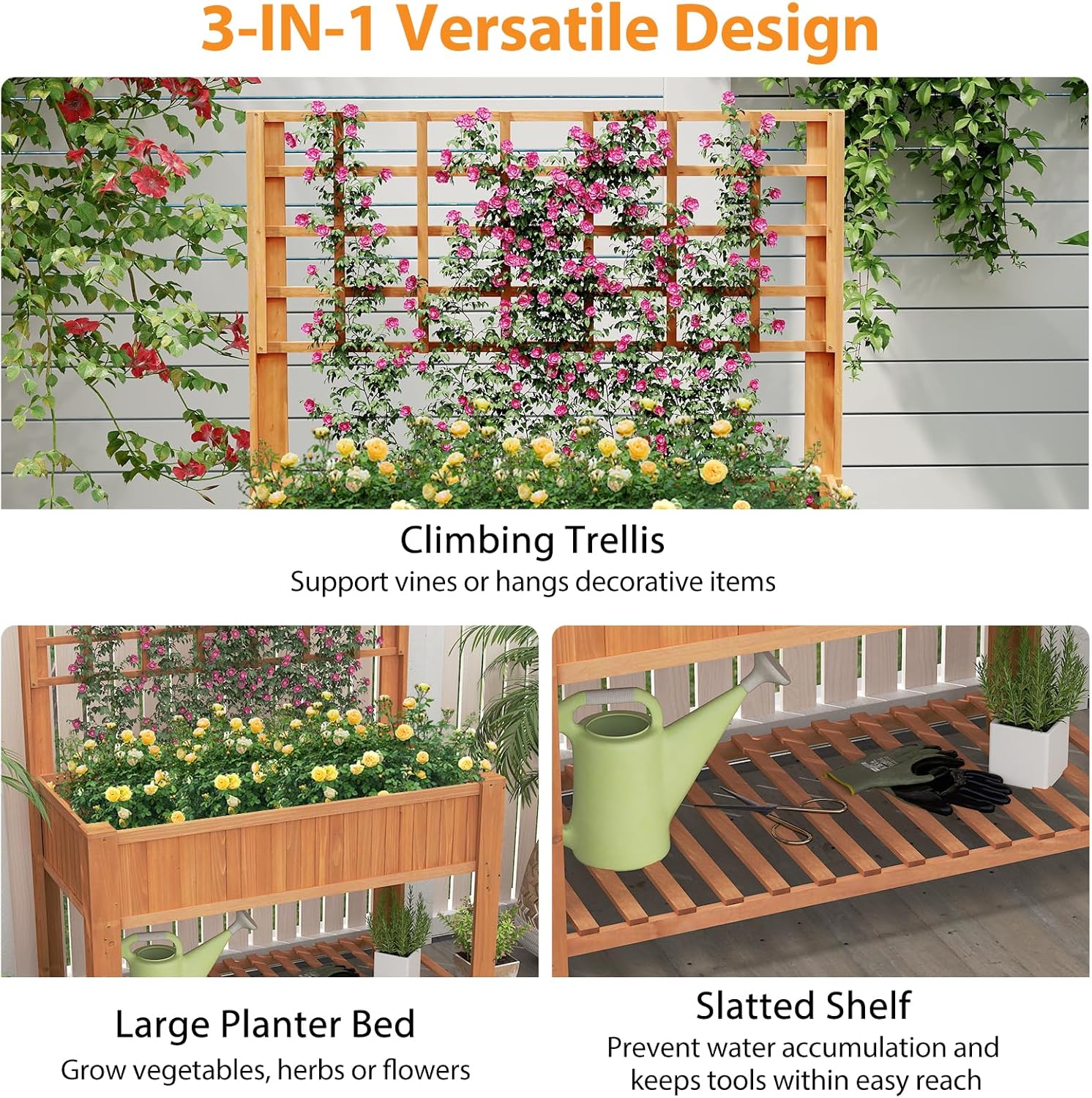 - [3-IN-1 Versatile Design]: The presence of a trellis can transform a simple garden bed into a dynamic area of growth and beauty. In addition, the large growing box provides ample space for cultivating a variety of plants. More than that, the bottom shelf offers a perfect storage solution for essential gardening supplies.