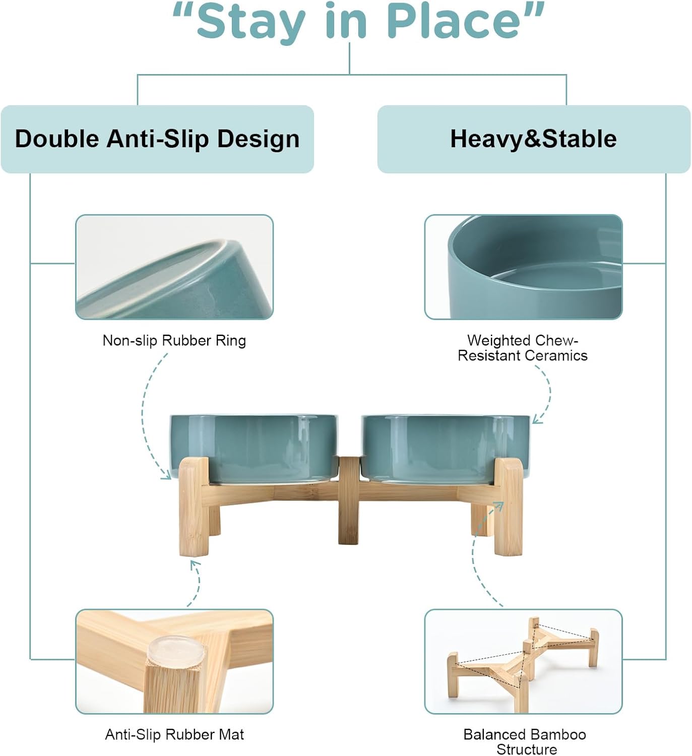 - Stable, Tip‑Resistant Design – A solid bamboo frame with Chew‑Resistant Heavyweight Ceramic, wide stance, and slip‑proof silicone pads join forces to create raised dog bowls that STAY IN PLACE on tile, wood, or laminate. Fewer spills mean cleaner floors and no accidental gouges or scratches or noisy