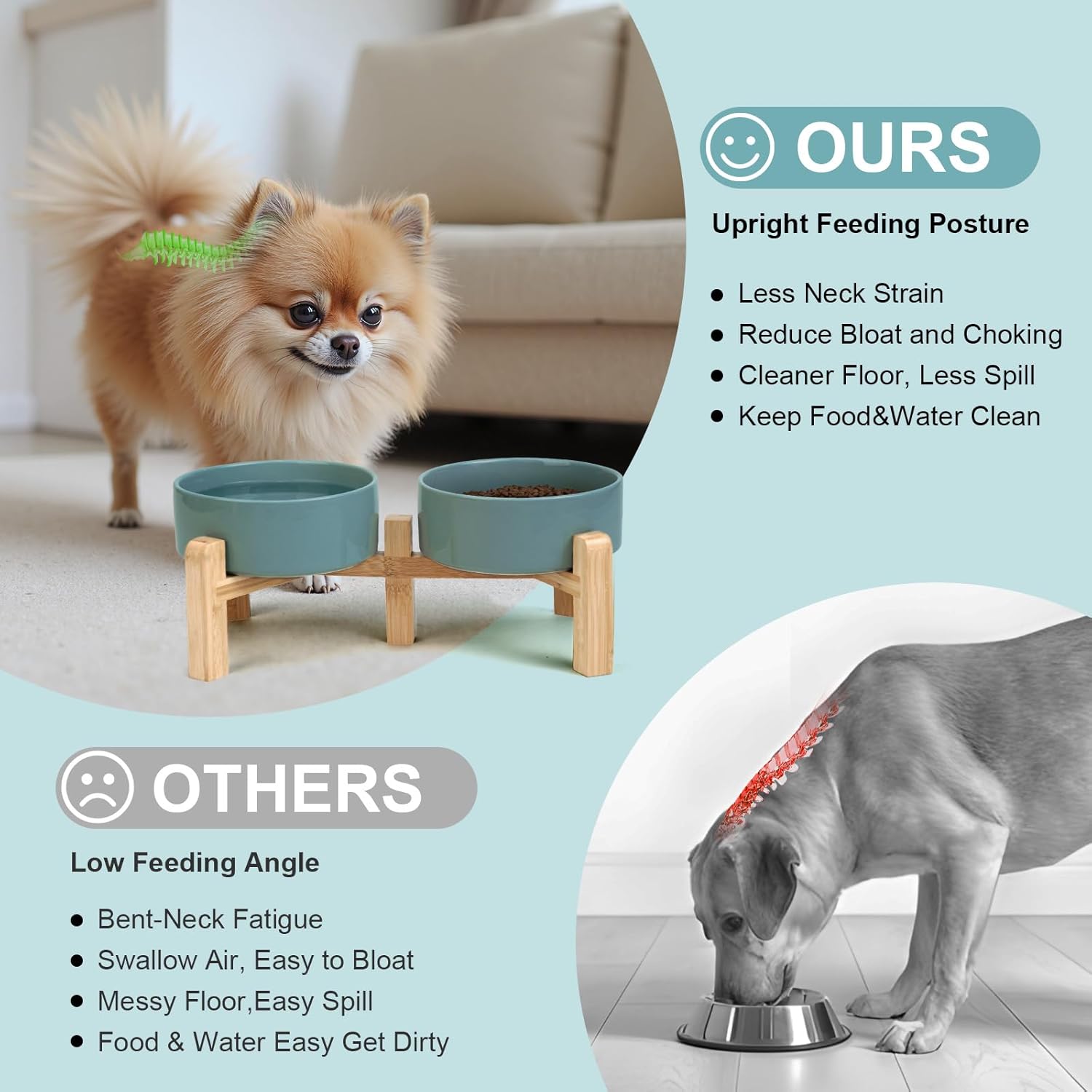 - Adjustable Bamboo Stand for Healthier Posture – Transform the set into true elevated dog bowls by choosing either of two height settings; the raised position helps dogs and cats eat in a more natural alignment, which can ease neck pressure and support smoother swallowing—ideal for pets prone to gulping, minor regurgitation, or digestive discomfort