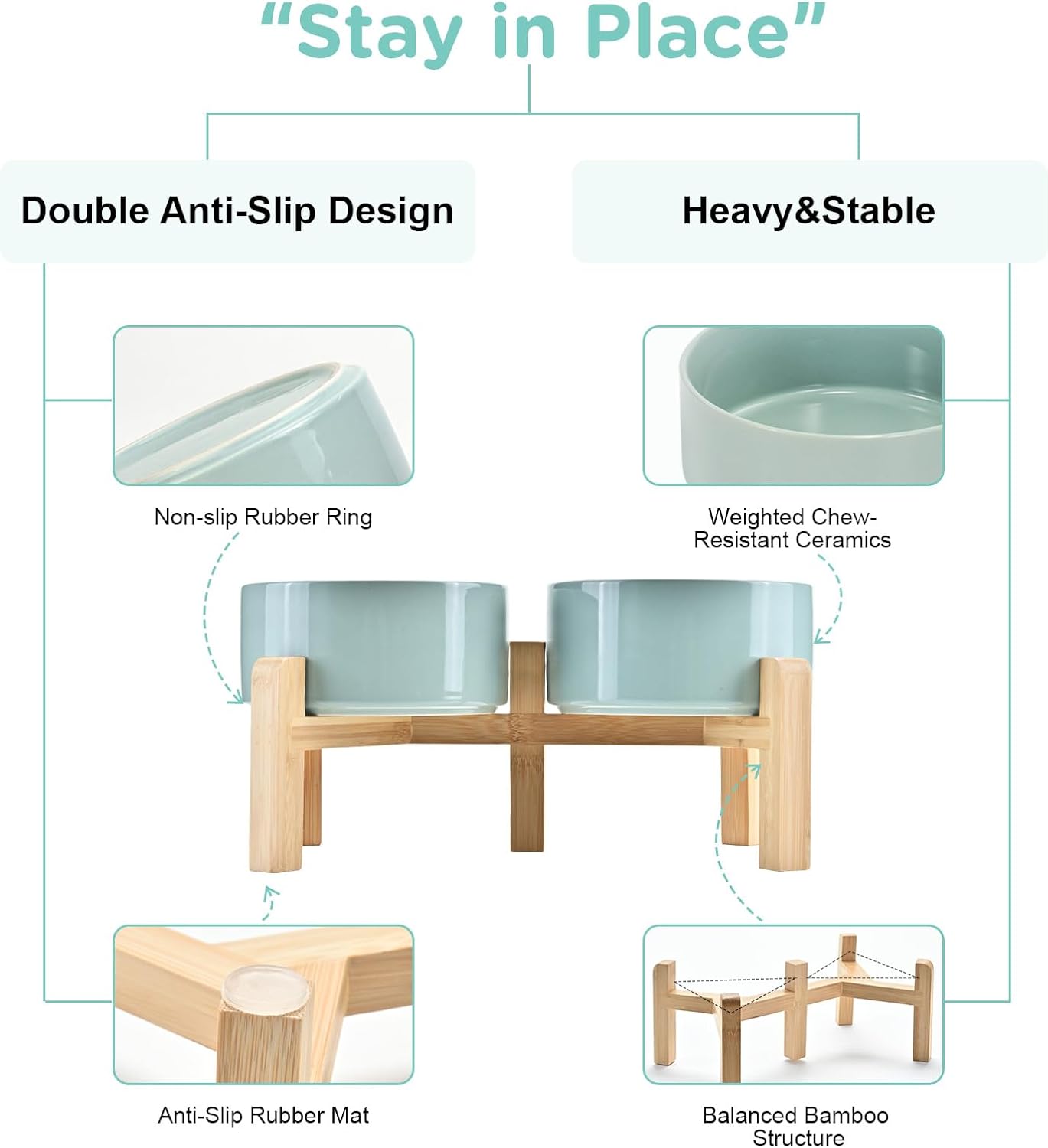 - Stable, Tip‑Resistant Design – A solid bamboo frame with Chew‑Resistant Heavyweight Ceramic, wide stance, and slip‑proof silicone pads join forces to create raised dog bowls that STAY IN PLACE on tile, wood, or laminate. Fewer spills mean cleaner floors and no accidental gouges or scratches or noisy