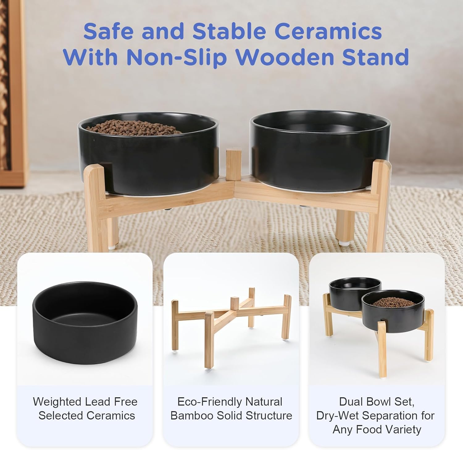 - Four Size Options to Match Any Breed – Choose 5.1" (13.5 oz), 6.1" (28.7 oz), 7.3" (42 oz), or 8.3" (60 oz) capacities with different height adjustable bamboo stand,to fit everything from kitten puppy, small to large sized breed dinners.The generous diameters and smooth ceramic surface handle everything from crunchy kibble and hearty wet food to broth‑soaked raw diets and occasional treats—the versatile pet bowls for every menu
