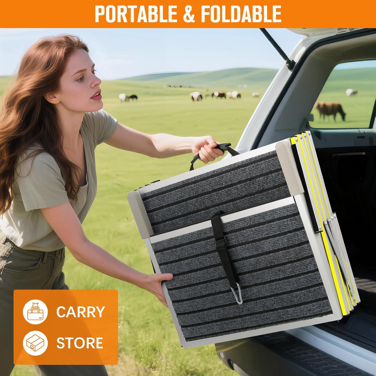 - 【Space-Saving Portability】When folded, the ramp compacts to convenient dimensions of 20"L×5.9"W×17.7"H for effortless storage in vehicle trunks or home storage spaces, featuring quick-release buckles that allow for tool-free setup in seconds when needed