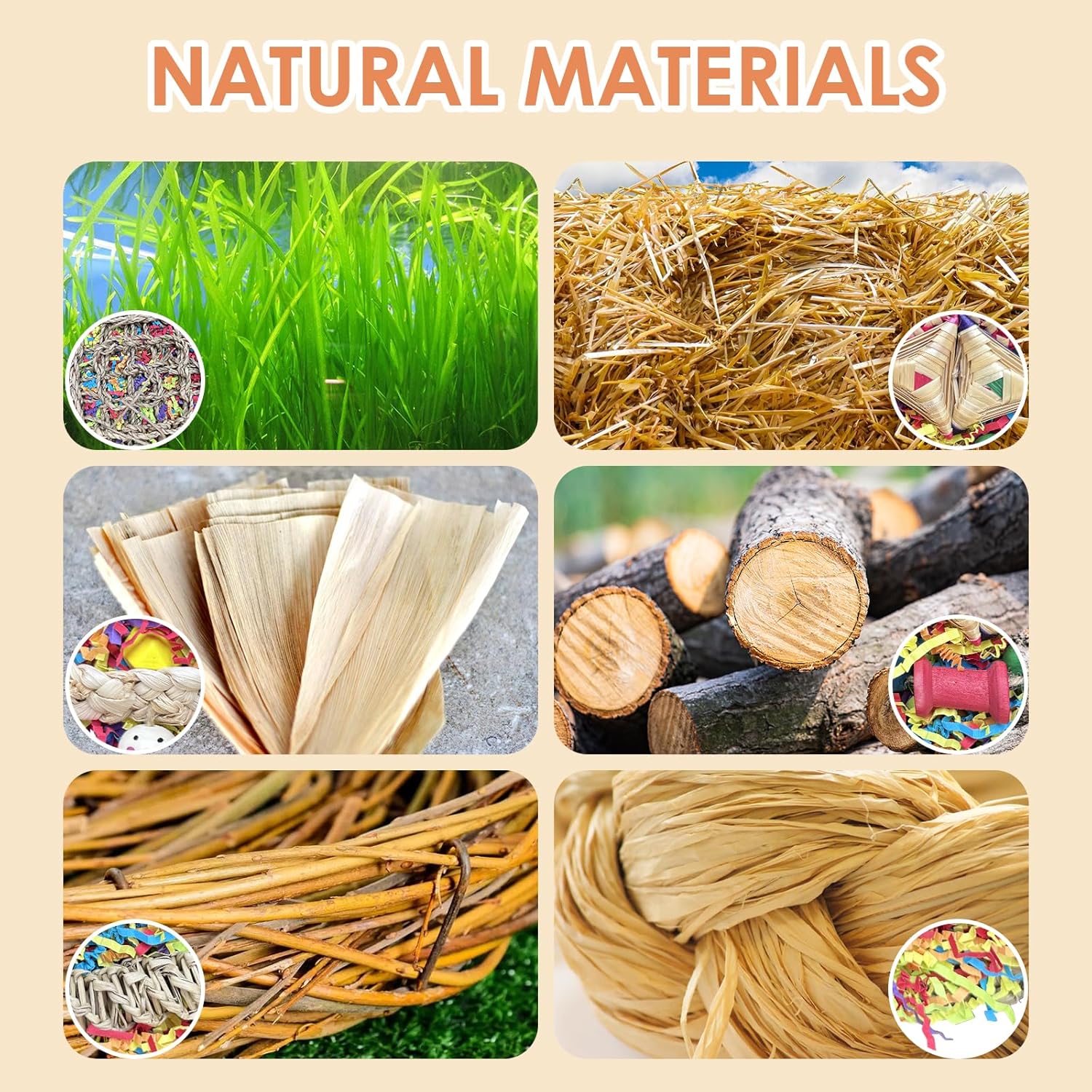 - NATURAL and SAFE MATERIAL : Recommended by Bird Behaviorists , Tyotrbs parrot toys are made of high quality seaweed hand-woven 24h as a base with 6 natural chewing elements (rattan ball, corn husk, corn cob, corn braid, lasso, loofah flakes, etc.), and many parrot owners give feedback of shinier feathers after using them