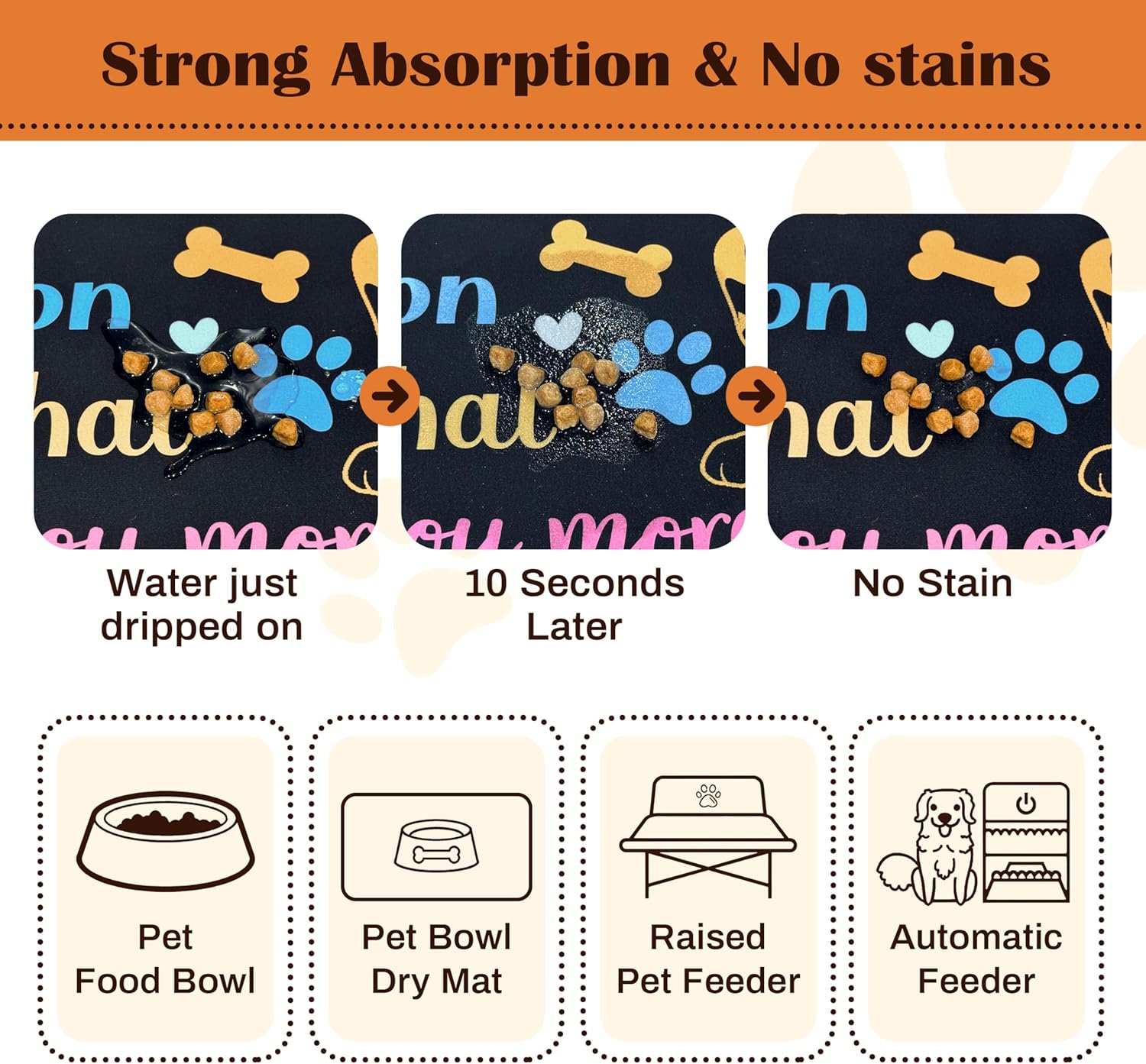 - Multi-Purpose Water Absorbent Mat - More than just a dog bowl mat, this mat is ideal for: food/water bowls, outdoor feeding, travel, or protecting floors from muddy paws. The pet mat works for all pet owners! Get your dog food mats for floors waterproofed today!