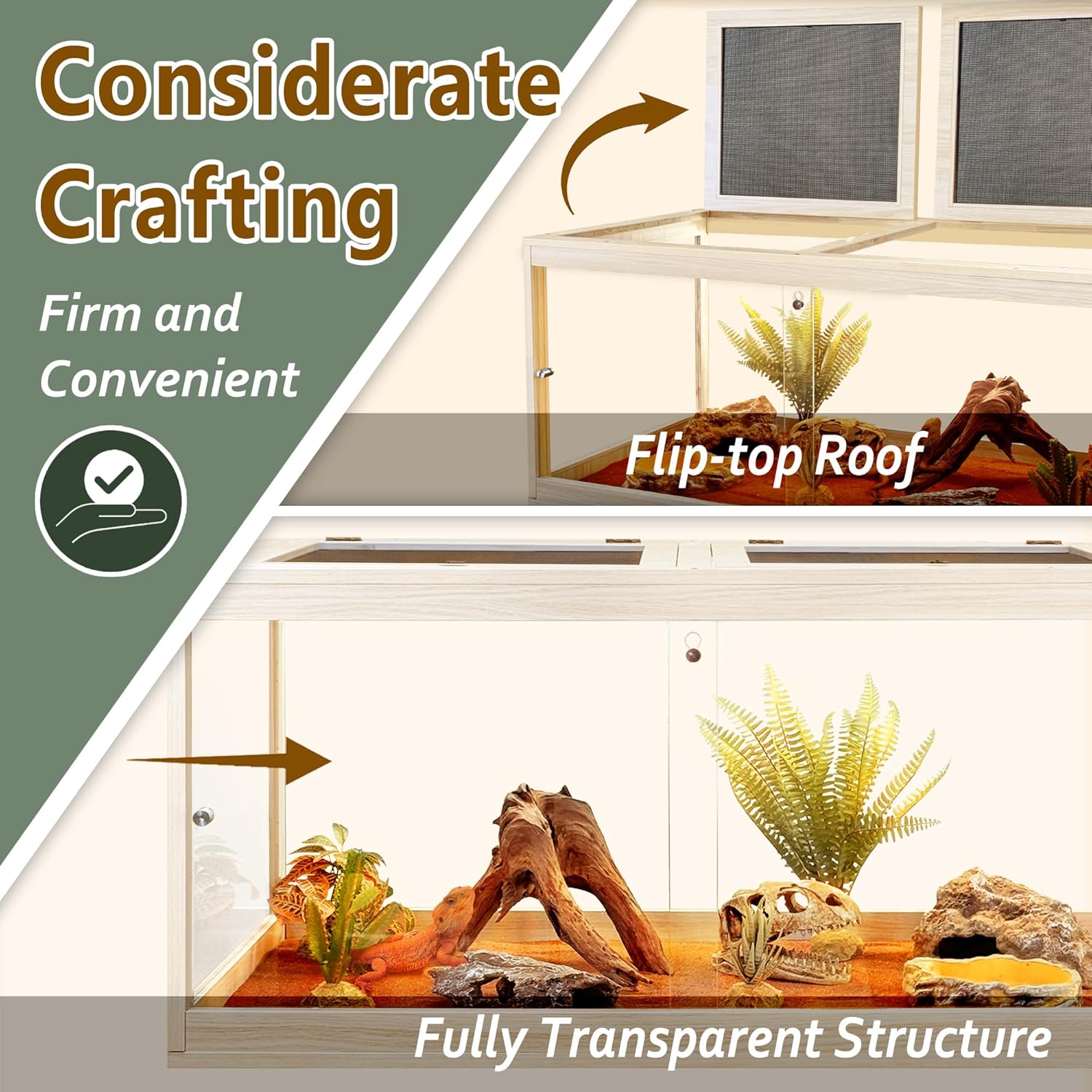 - 【High-Quality Reptile Habitat】Designed for reptile enthusiasts who seek a dependable and comfortable space for their pets, this high-quality habitat is crafted from sturdy solid wood treated with a water-repellent polyester coating. It's ideal for terrestrial reptiles and not intended for aquatic use, providing a dry and stable environment for daily activity.