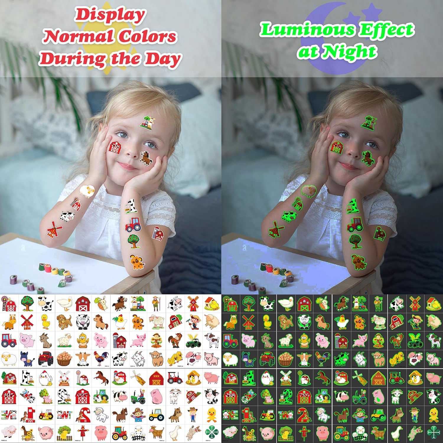 - 🐄TATTOOS FOR FARM BARNYARD ANIMAL THEMED DECORATION: FARM GLOW IN THE DARK DIE-CUT TATTOOS for people who love farm, farmhouse , Animal. Featuring 8 sheets with 96 pcs of lovely, fun and colorful design: Cow, pig, horse, tractor... Each sheet measures 6.3 * 4.7 inches. You can temporarily tattoo them on your body or objects such as phones, bottles, laptop…