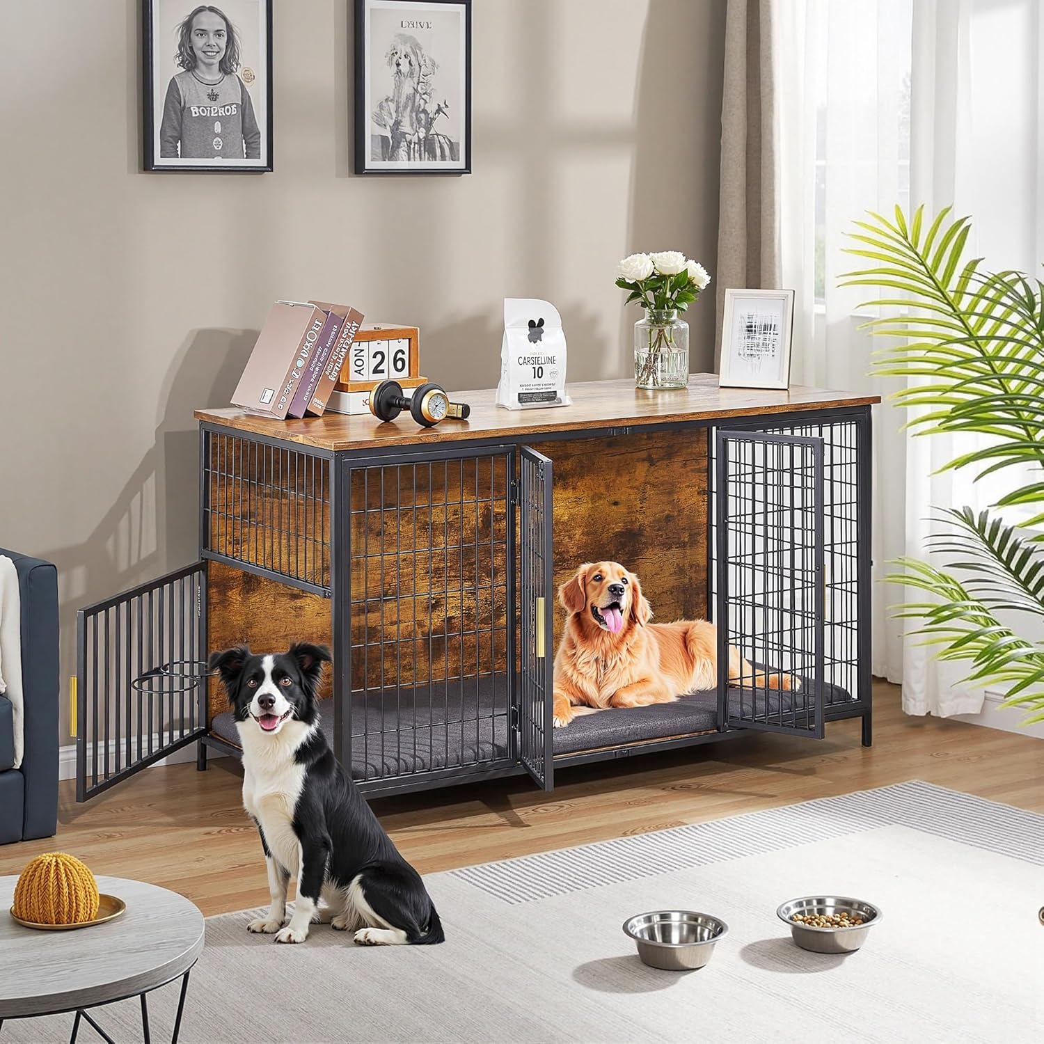 - Sturdy Metal & Wood: Made of durable steel frame and high-quality wood, The double dog crate furniture ensuring long-lasting use and a safe space for your pets.