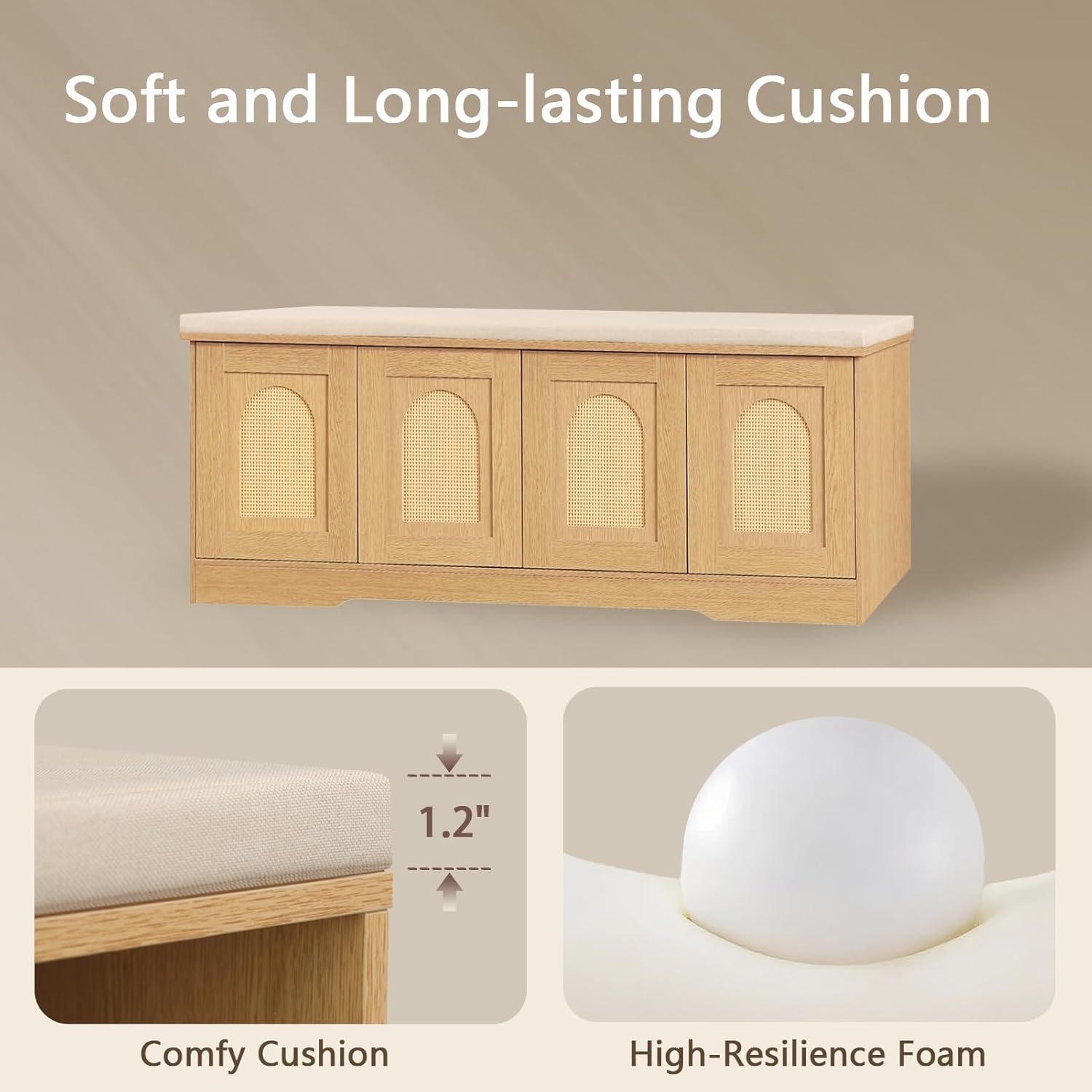 DINZI LVJ Shoe Bench, Entryway Storage Bench with Doors, Cushion, 2-Tier Shoe Rack with 8-Cubby, 47.2”L x 13.8”W Shoe Organizer Cabinet, Adjustable Shelf, Living Room, Bedroom, Natural with Rattan