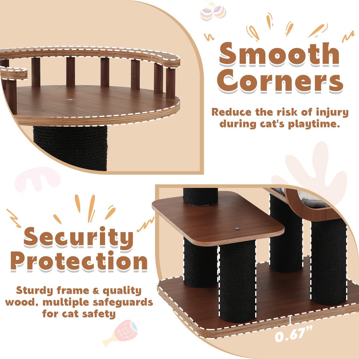 - 【Pet-friendly Material】Our cat tree crafted from superior walnut wood that combines luxury with stability. The top platform features a protection bar that reduces injury risk by preventing falls. This cat furniture is designed to provide a safe, sturdy, and entertaining home for your kittens.