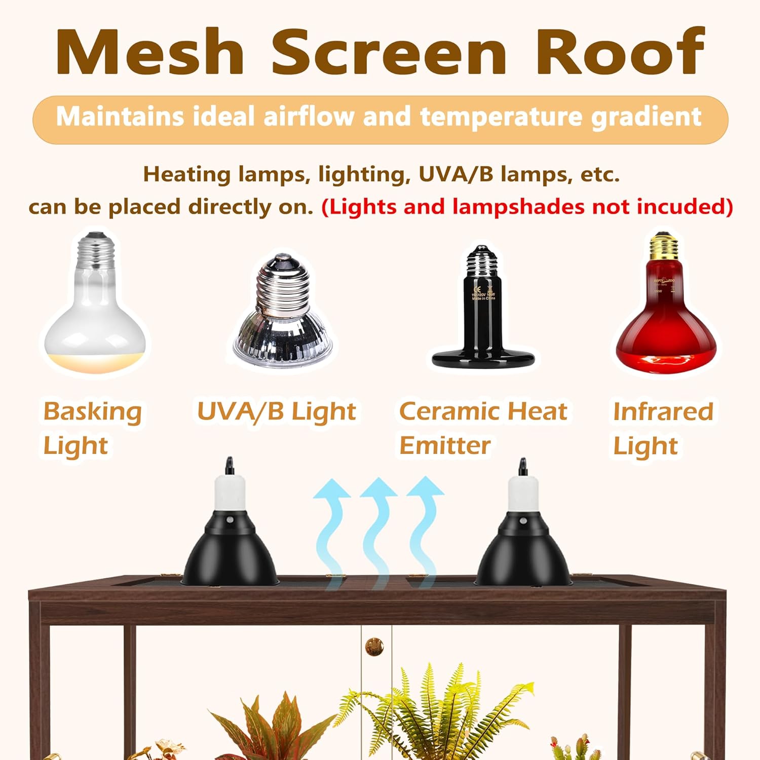 - 【Functional Elegance】Designed with functionality in mind, our reptile terrarium features double sliding front doors that can be effortlessly opened or secured with a lock to prevent escape attempts. The top is fitted with sturdy metal mesh, allowing for proper ventilation and accommodating the direct placement of heat lamps and UVA/B lights (not included) to ensure optimal temperature regulation.