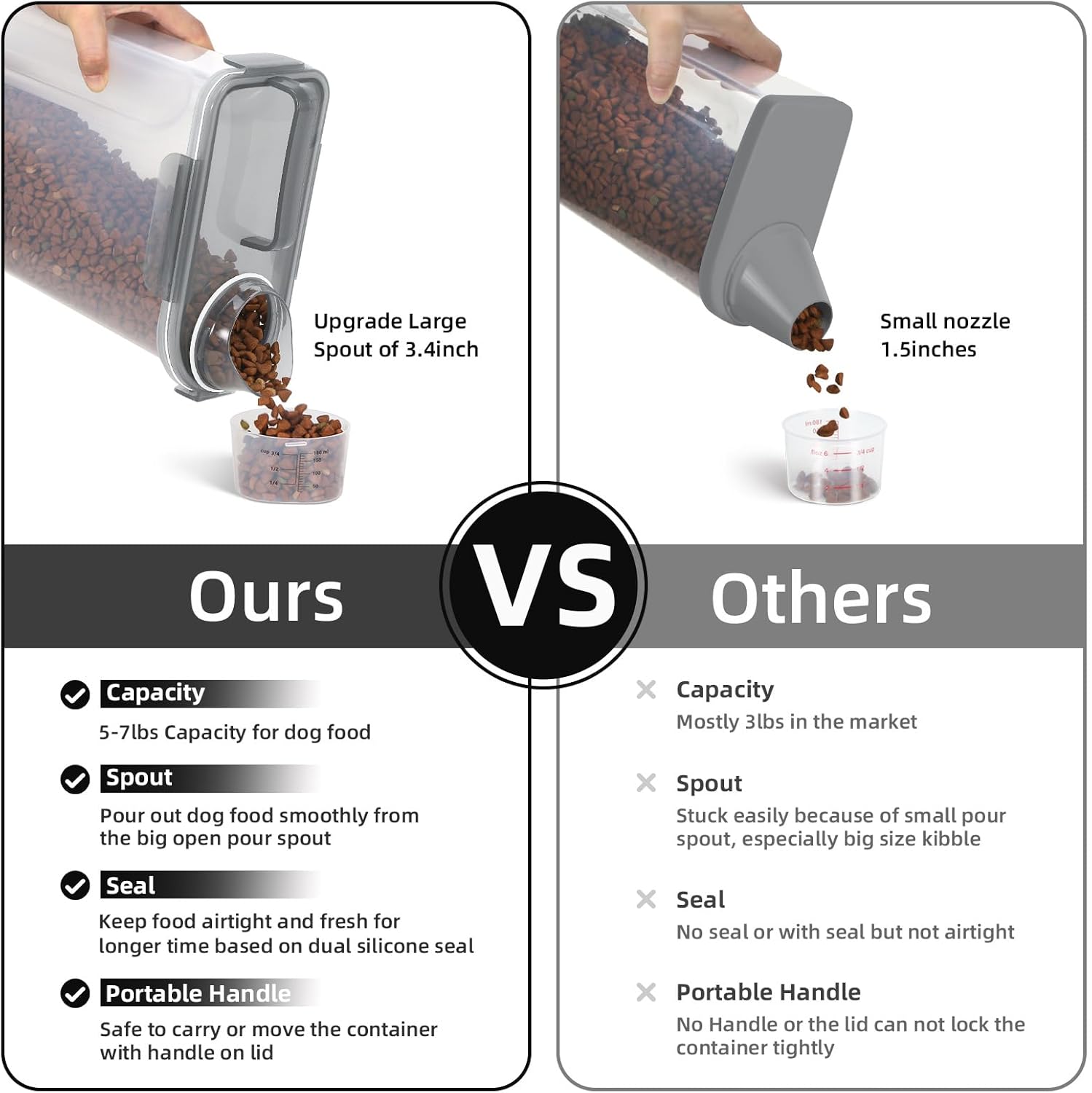 - FUNCTION: This airtight dog food container with portable handle has an airtight design,-has 2 silicone seals and 4 sealing buckles,which can keep your food dry and fresh, the portable handle and large spout design can easily Easily pours food out,also perfect for traveling, hiking, camping or picnicking with your dog
