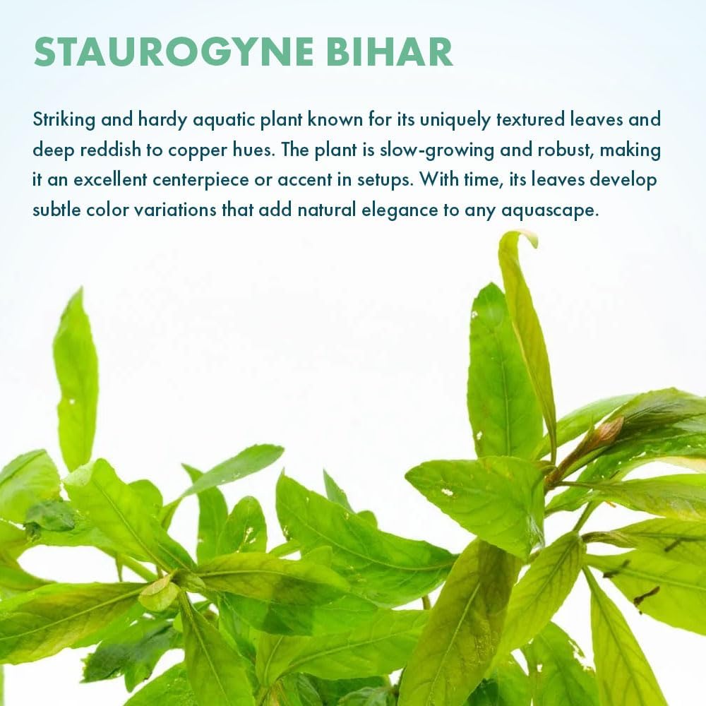 - Staurogyne Bihar features rich olive green stems and dense foliage, ideal for creating structured contrast and textured layering in the foreground or midground of aquascaped tanks.
