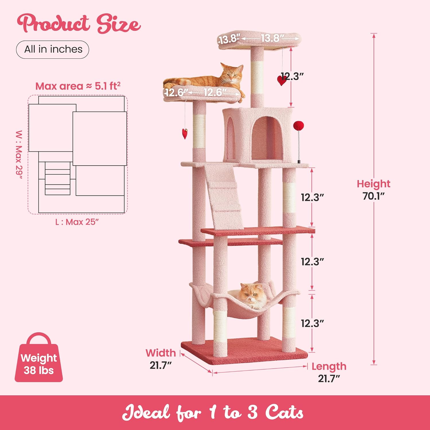 MWPO Cute Cat Tree, 70.1-Inch Tall Pink Cat Tower for Indoor Cats Large Adult, Multi-Level Cat Condo with 5 Scratching Posts, 2 Padded Perches, Hammock, Dangling Toys
