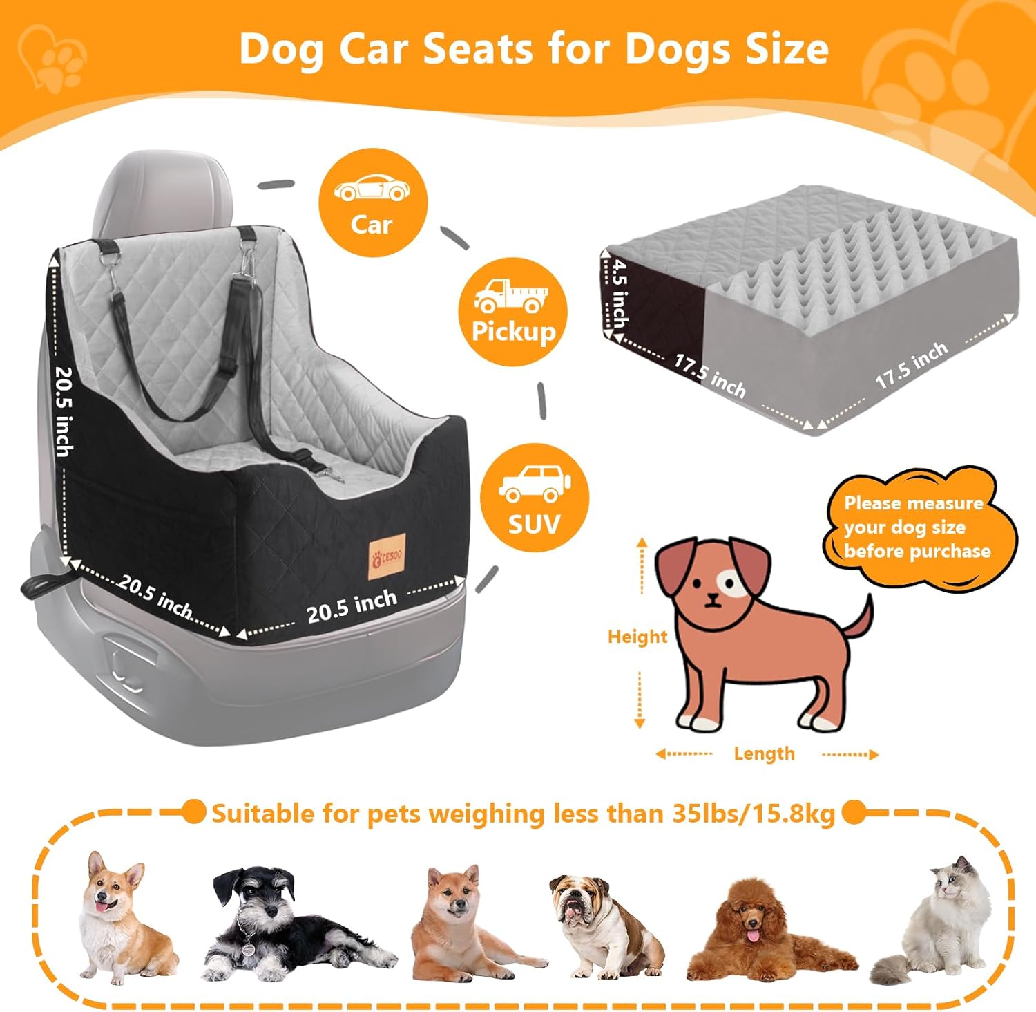 - Ideal Size for Dog Car Seat - The size of the Small/Medium dog car seat is 20.5in x 20.5in x 20.5in, Can be installed very well on the front or rear seats of cars. Which can easily accommodate 40 lbs small and medium-sized dogs within pounds for Yorkshire Terriers, Schnauzers, Corgis, Bulldogs, Chihuahuas, Pomeranians, Dachshunds, Shih Tzus, puppies, cats and more.
